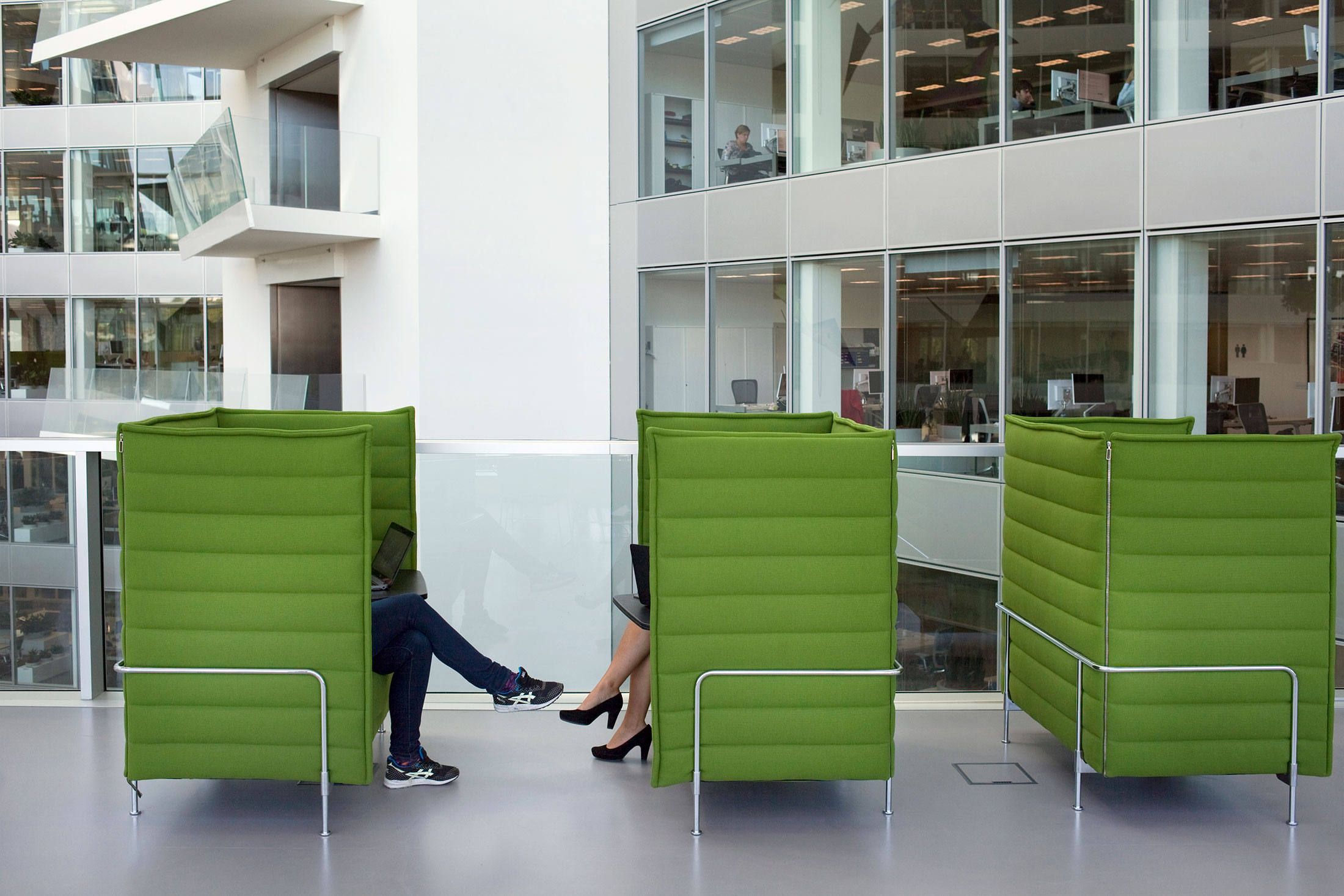 The atrium and its iconic slanted roof, which looks from the outside as if a wedge has been sliced off the building, floods the workspaces with daylight and provides a sound buffer from the adjacent highway and train tracks. Every workspace is within 7 meters (23 feet) of a window.