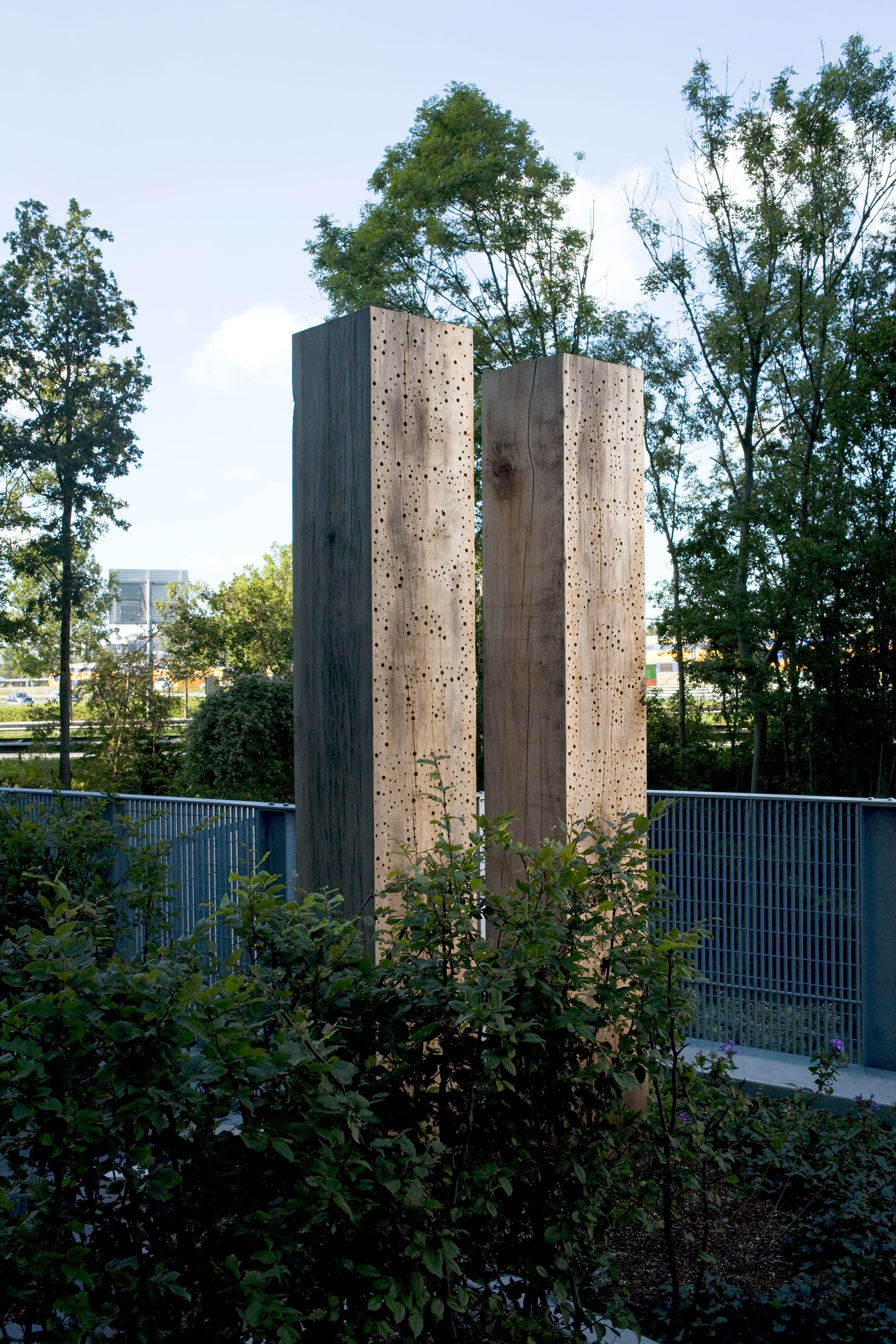 Birds, bats, bees, and bugs. These are the building’s neighbors on the north-facing terrace. OVG worked with Amsterdam officials to establish a continuous path of vegetation that supports beneficial insects throughout the city. Birdhouses and bat boxes are tucked discreetly into the landscaping. These pockmarked towers support various species of solitary bees, which buzz about the flowers on the public terrace.![]()