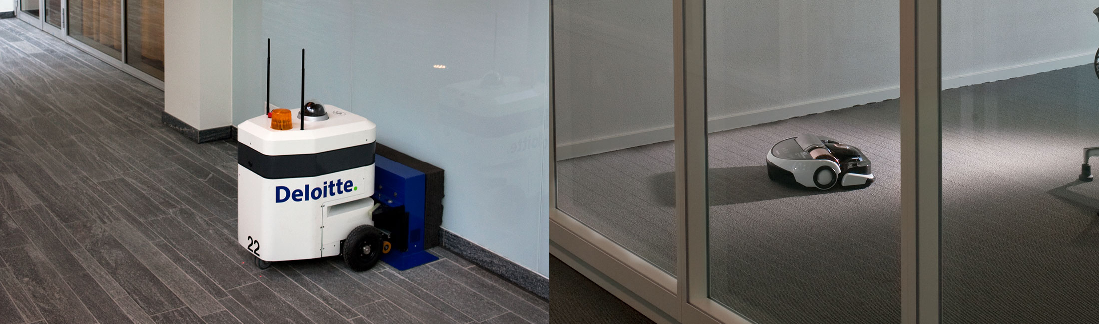 This little robot (bottom left) comes out at night to patrol the grounds. If an alarm goes off, the camera-equipped automaton can identify the culprit or let security know it was a false alarm. It cruises around automatically like a Roomba or can be commandeered by remote control. Deloitte's Erik Ubels says he noticed similar robots in shipyards, tracked down the manufacturer, and asked if they could be modified for office security.