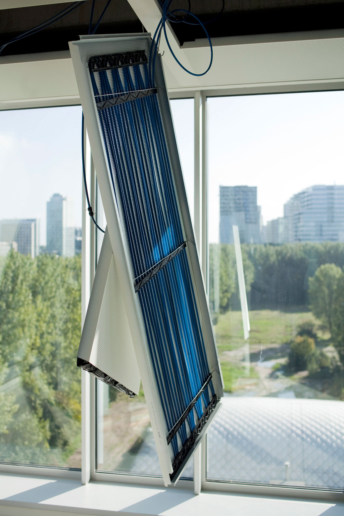 The Edge is wired with a vast network of two different kinds of tubes: one that holds data (ethernet cables) and another that holds water. Behind each ceiling tile is a massive coil of thin blue piping that delivers water to and from the building’s subterranean water storage for radiant heating and cooling.