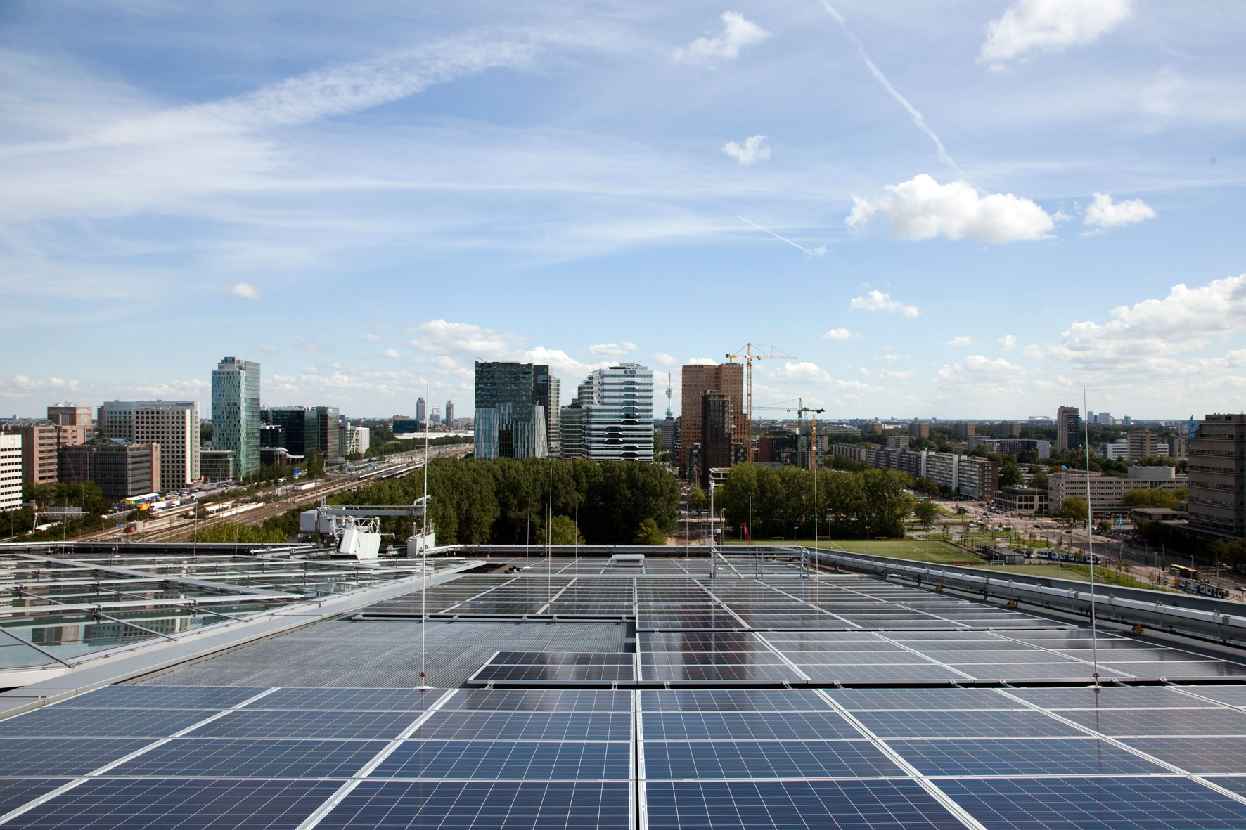 The southern wall is a checkerboard of solar panels and windows. Thick load-bearing concrete helps regulate heat, and deeply recessed windows reduce the need for shades, despite direct exposure to the sun. The roof is also covered with panels. The Edge uses 70 percent less electricity than the typical office building, but it wasn’t until OVG installed panels on the rooftops of some neighboring university buildings that the Edge was able to boast that it produces more energy than it consumes.