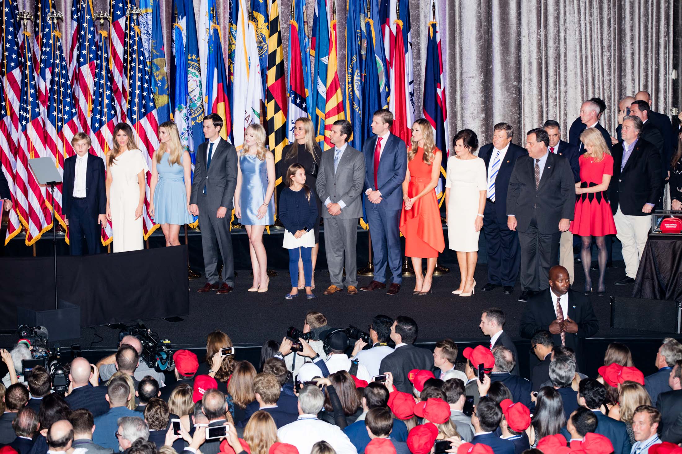 Family and prominent supporters, including New Jersey Governor Chris Christie (front right) and campaign manager Kellyanne Conway (right in red), look on as Trump speaks to the crowd.