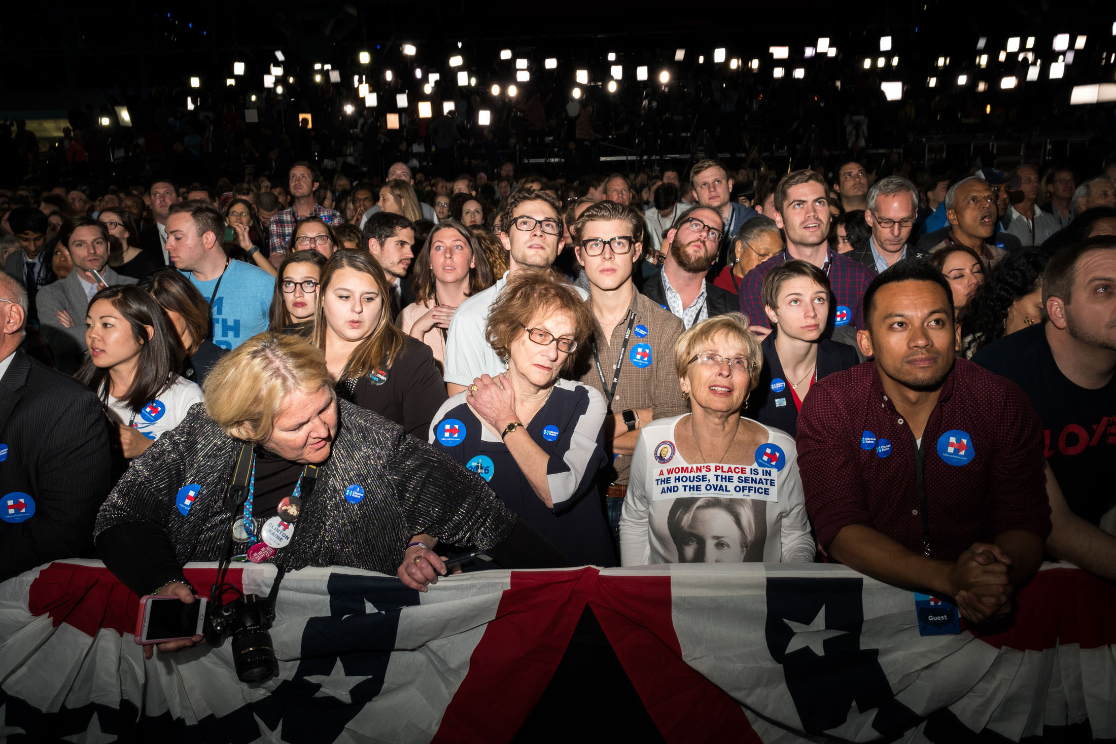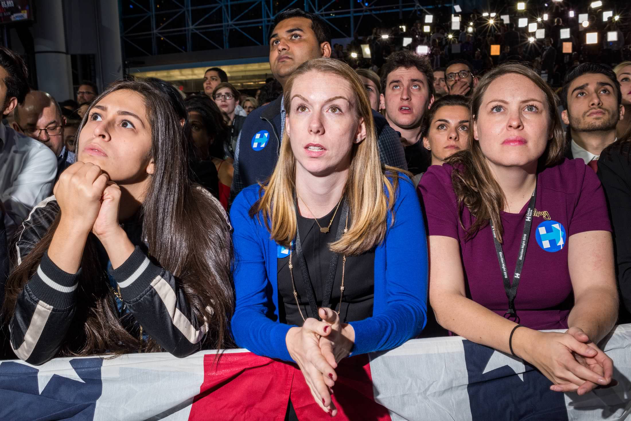 From left: a Clinton supporter watches after polls close on the West Coast; Jonathan Whitley, a guest at Clinton’s election night event, takes in the news that she has conceded.