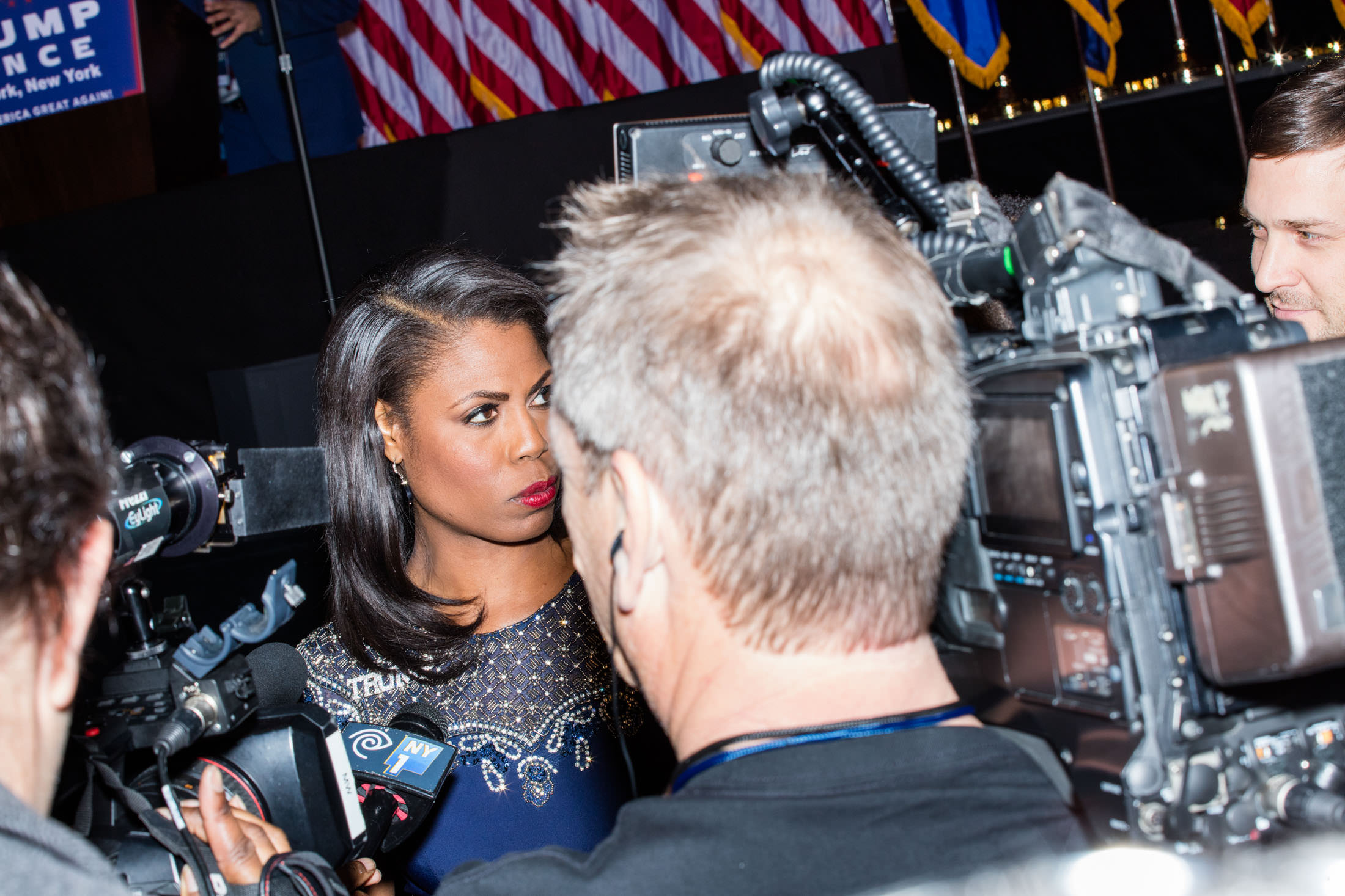 Omarosa Manigault, a contestant on the first season of Trump’s reality show The Apprentice, speaks to the media early in the night.