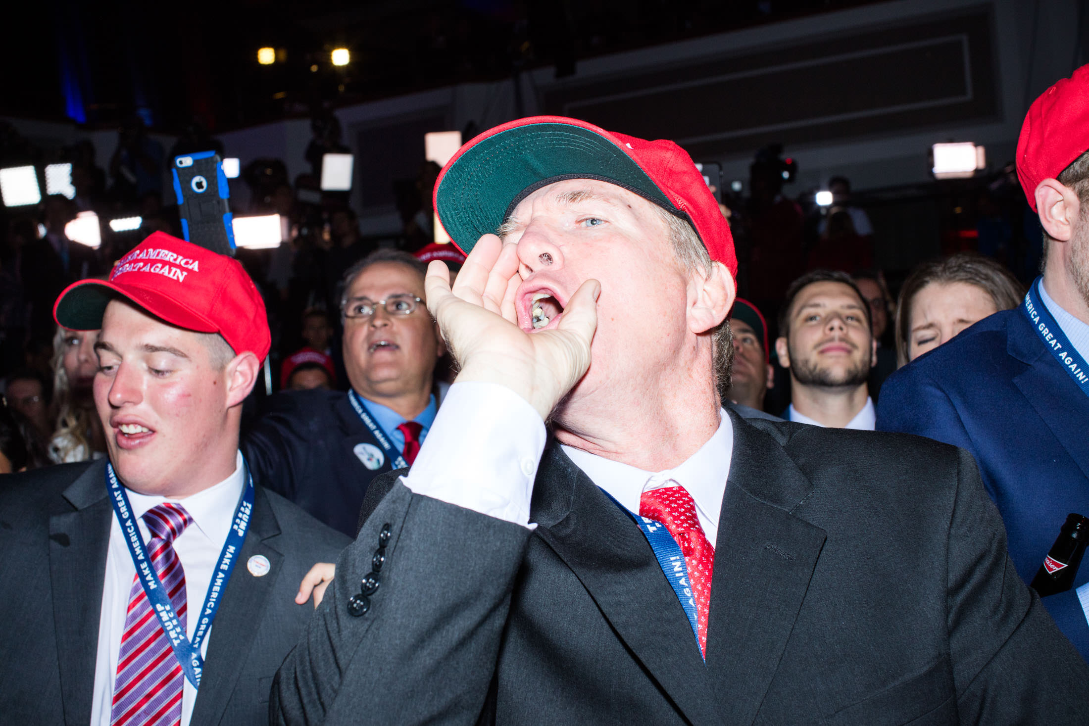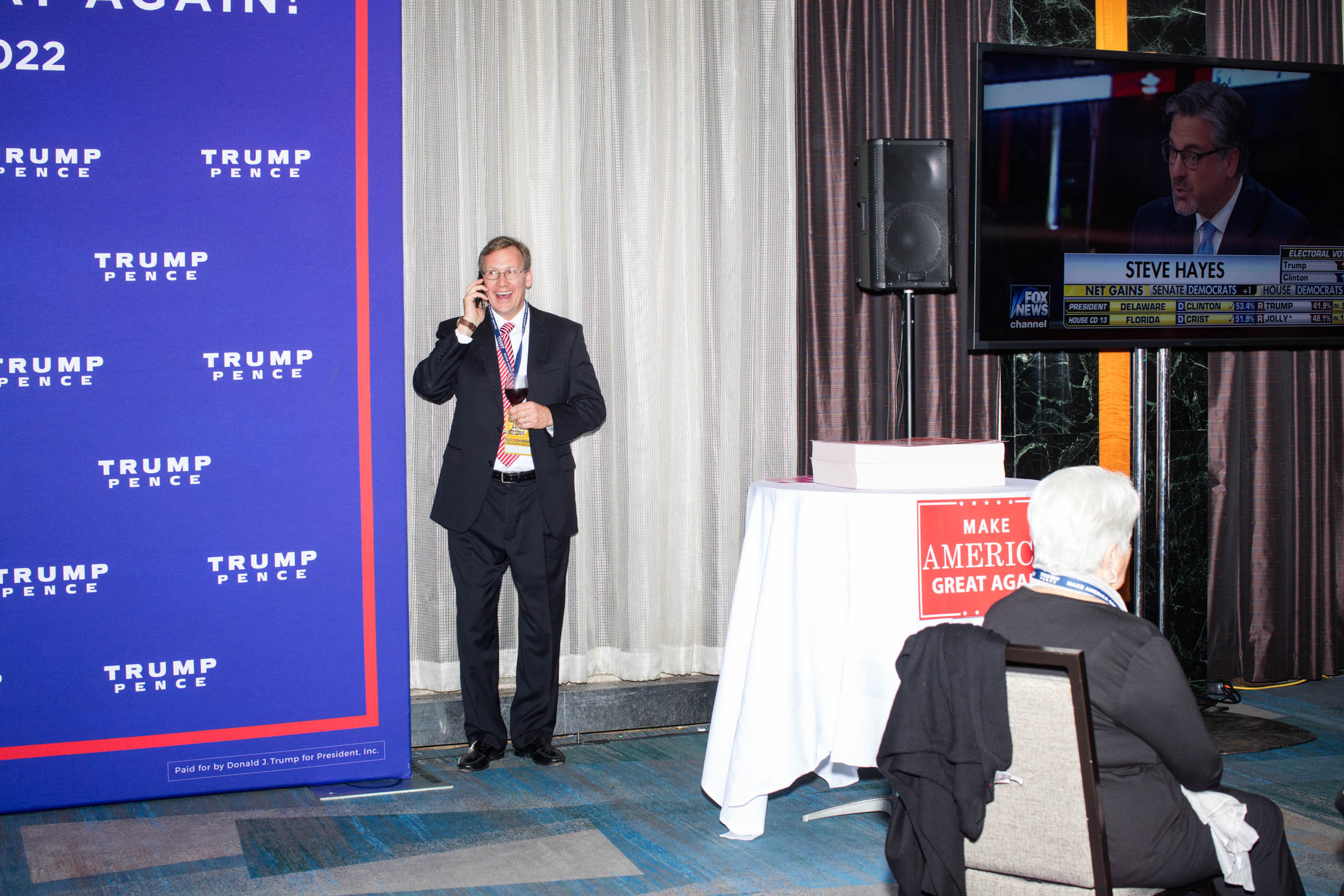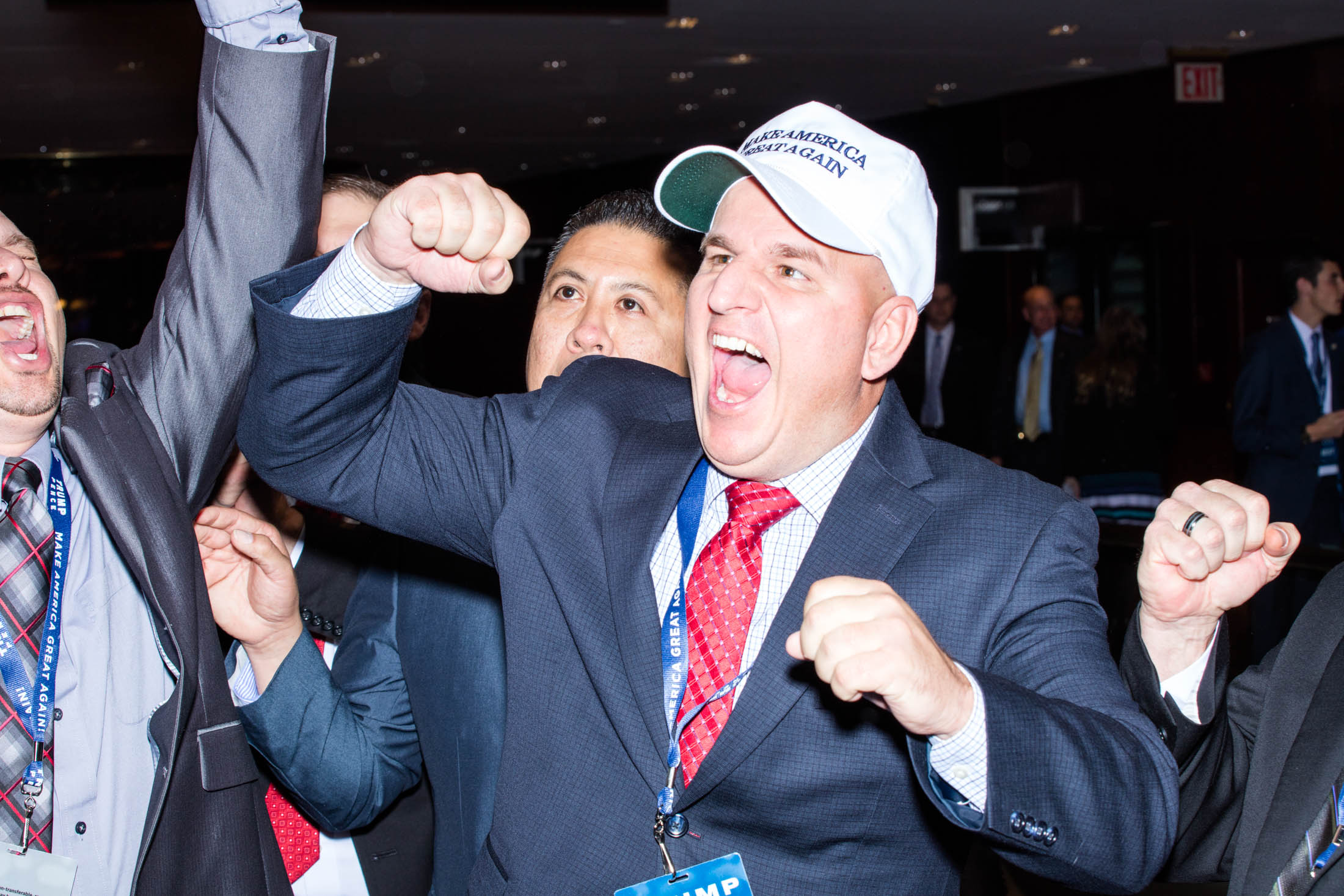 Brandon Judd, president of the National Border Patrol Council of Malta, Montana, celebrates as results are announced in favor of Trump.