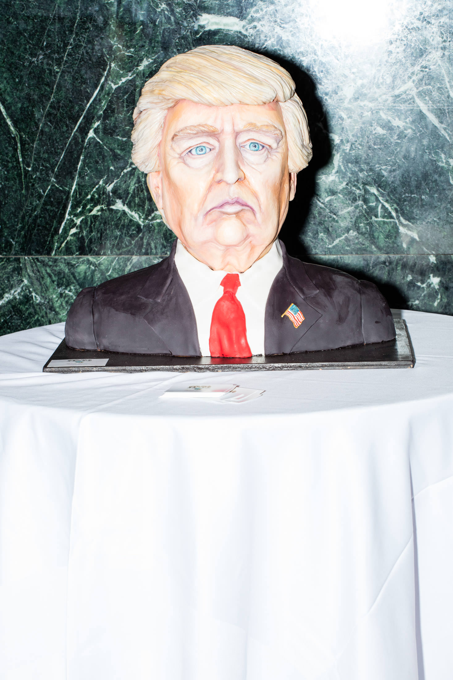 A cake sculpted into a likeness of Trump designed by Melissa Alt of Teaneck, N.J., on display near a bar in the ballroom.