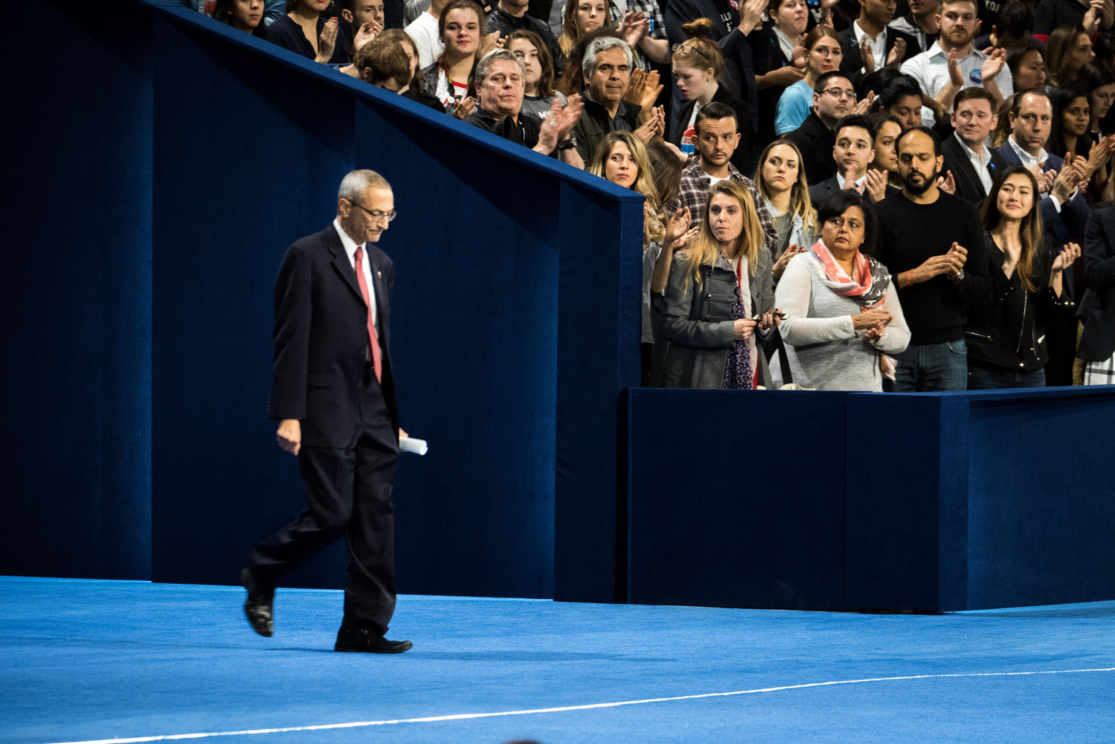 Campaign chairman John Podesta walks onto the stage to announce that Clinton will not be speaking.