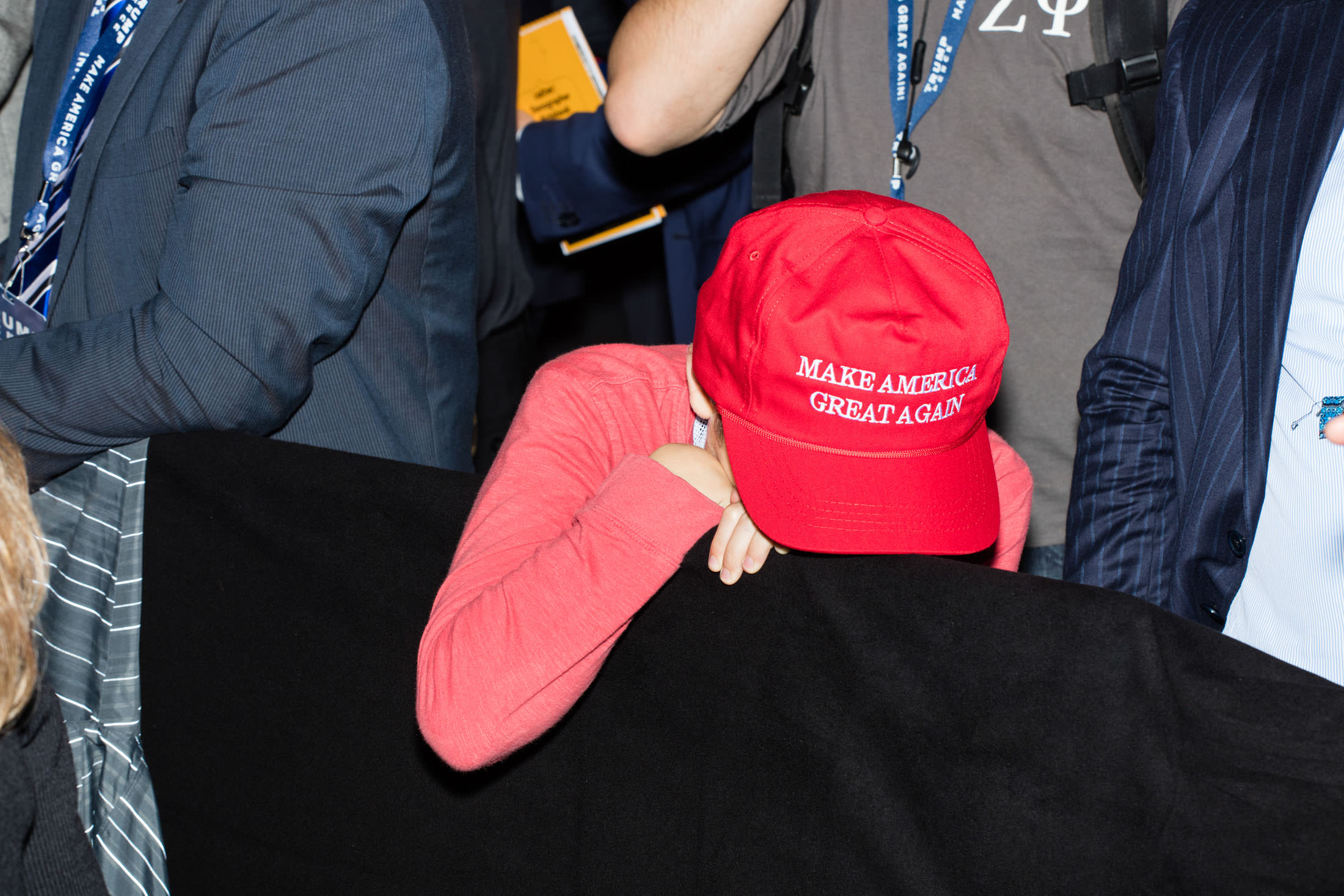 A boy rests his head on a crowd control barrier after Trump left the ballroom.