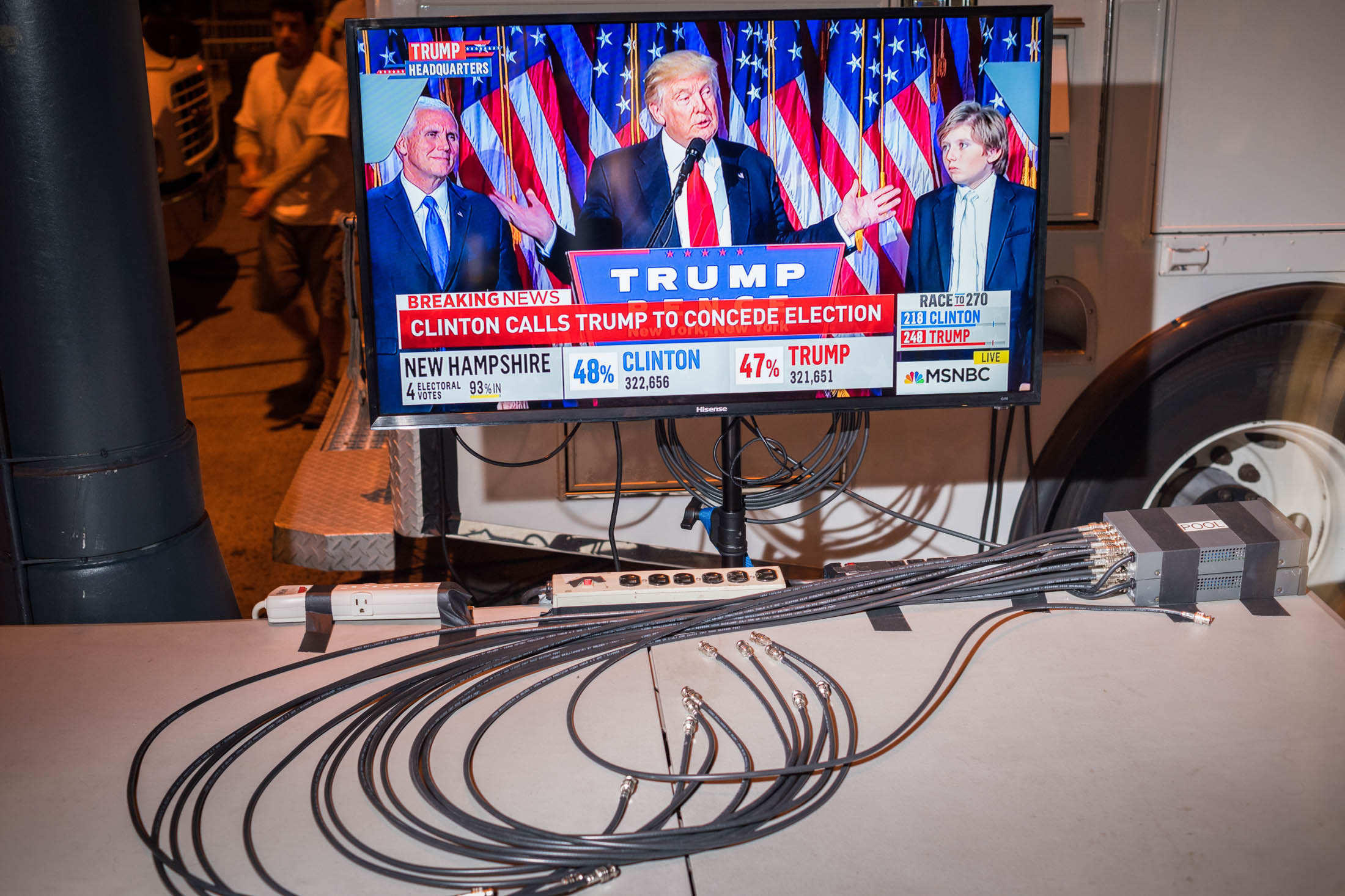 Outside the Javits Center, a satellite truck’s live feed of President-elect Donald Trump’s victory speech.