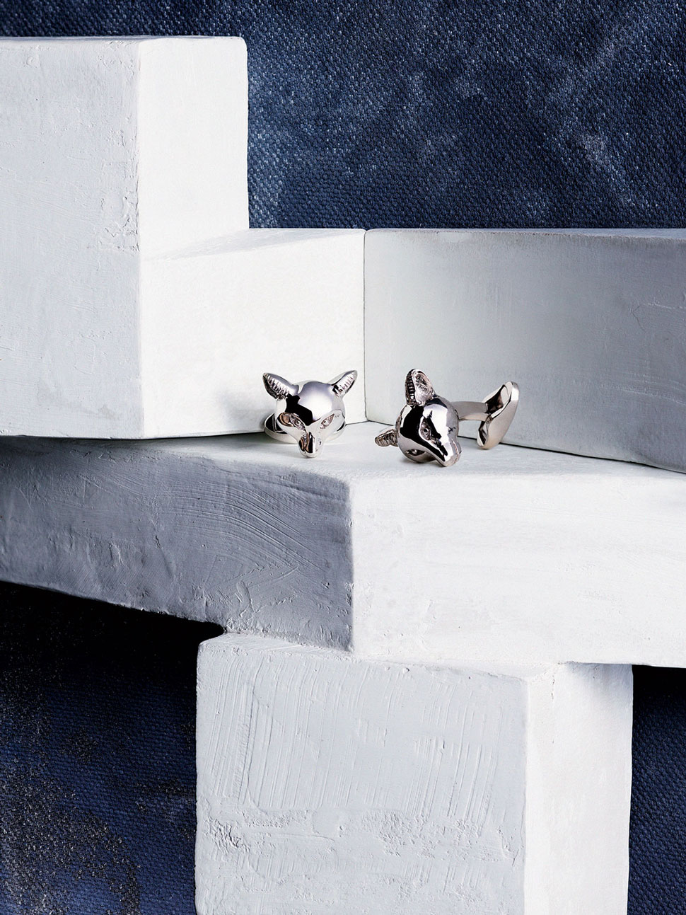 Swedish shirtmaker Eton recently introduced playful animal-inspired cuff links in materials such as gunmetal and rose gold. This pair, made out of rhodium, have toggles that snap to 90 degrees underneath a fun fox head design. $210; etonshirts.com