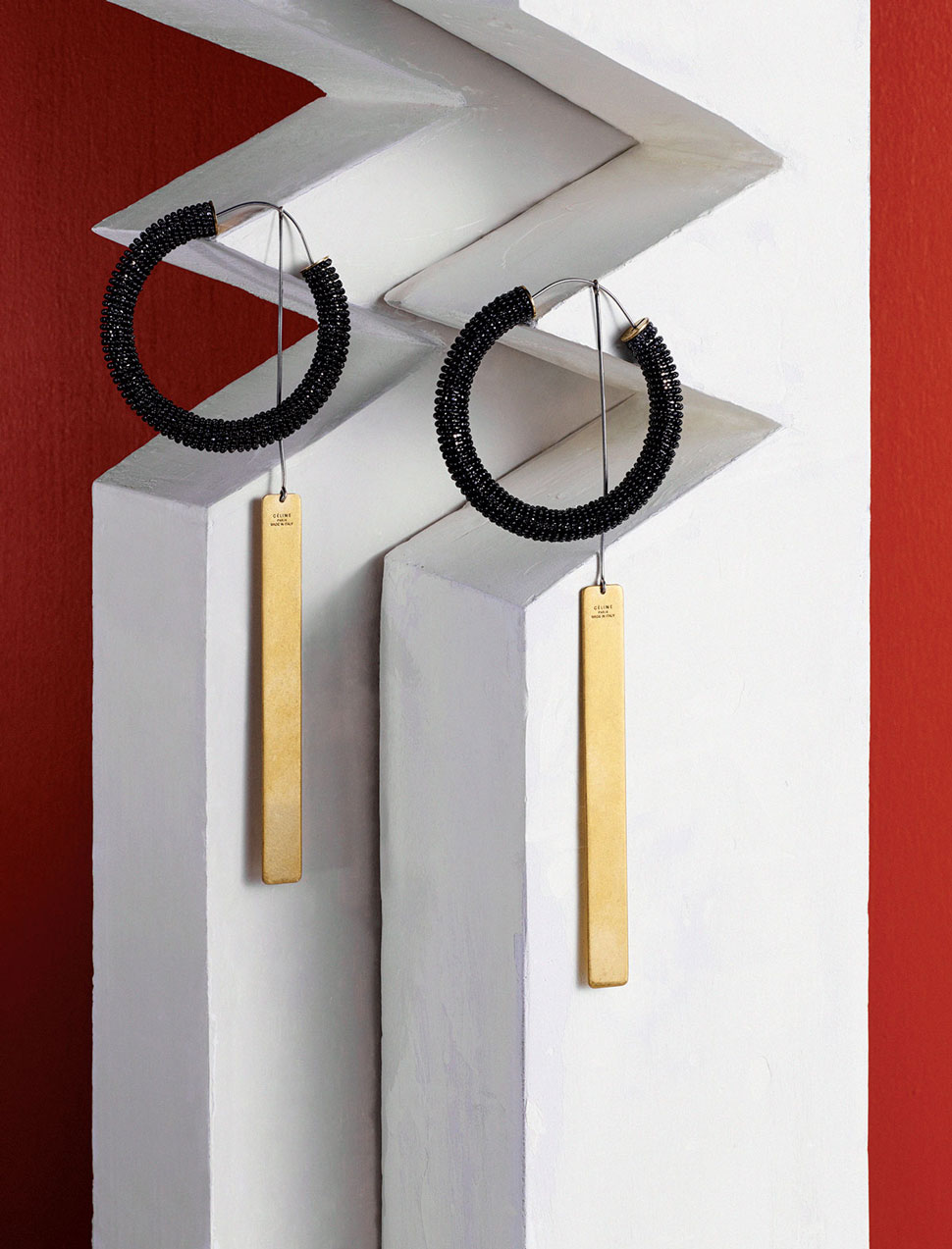 Oversize earrings are the thing for spring. These pairs from Céline can be worn separately or, better yet, combined to create a two-in-one effect. The beaded hoops go in the ear; the gold-and-brass shoulder dusters connect up top. $820 (beaded), $520 (gold); celine.com