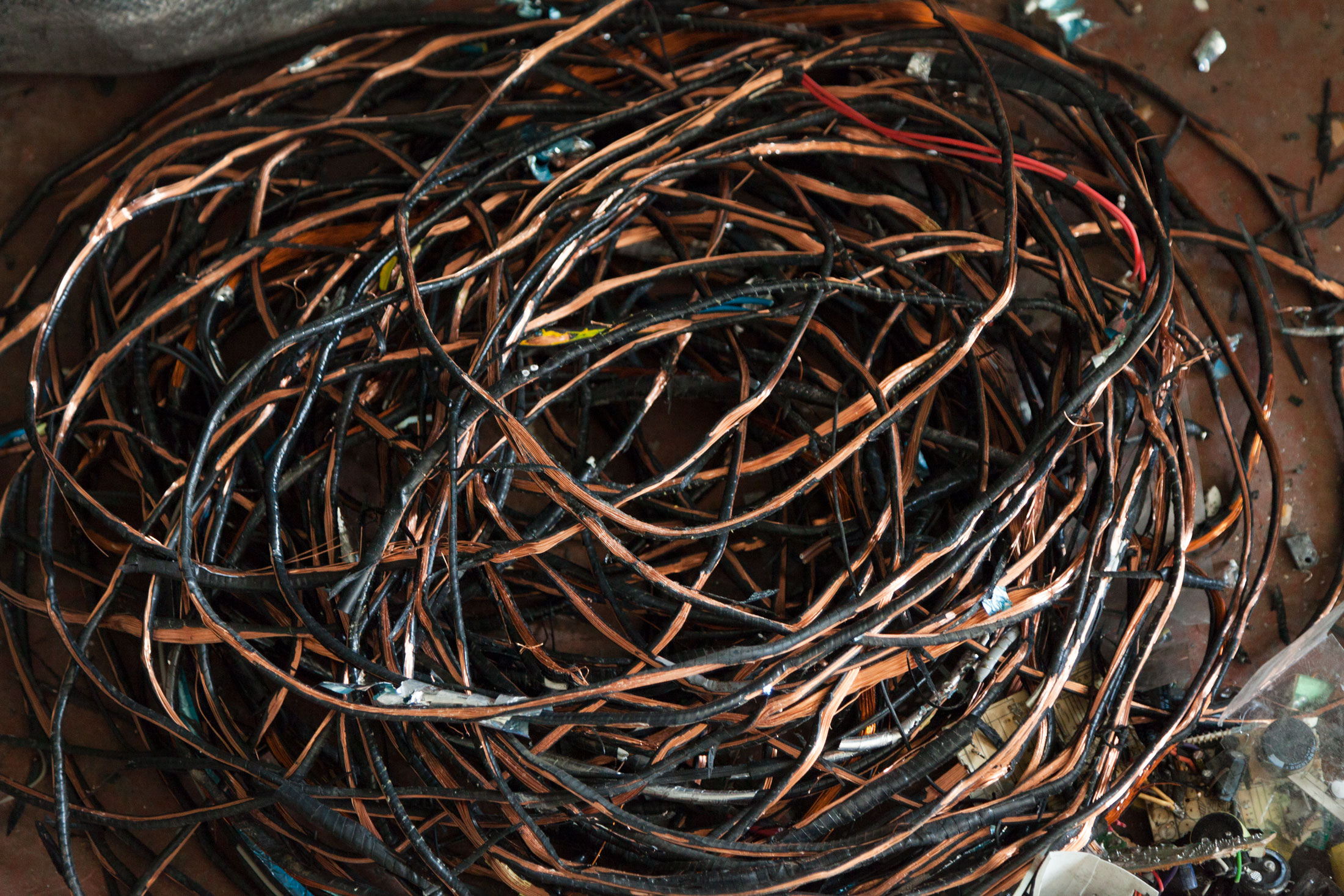 Lupita Barajas, who’s been working for the Gómez brothers for five years, pauses from prizing some copper wiring from one of the cable boxes. She says she does it because the job pays well. She’s been sitting in the summer heat, in the street, for three hours, bringing her hammer down against steel and plastic. She’s visibly tired. In the beginning, the work makes your body ache, she says, and the fumes give you a headache. “But it’s cool. I like making my own money.” The Gómezes have 21 people working off the books, without any of the benefits required by Mexican labor law, including health insurance. Barajas earns 1,500 pesos ($79) a week on average, almost double the 800 pesos she’d make at a factory. “This can be beautiful—this is the beautiful thing about it,” Jesús says. “Why do people prefer to do this work, instead of work in a factory or somewhere safer perhaps? Because this pays better.”