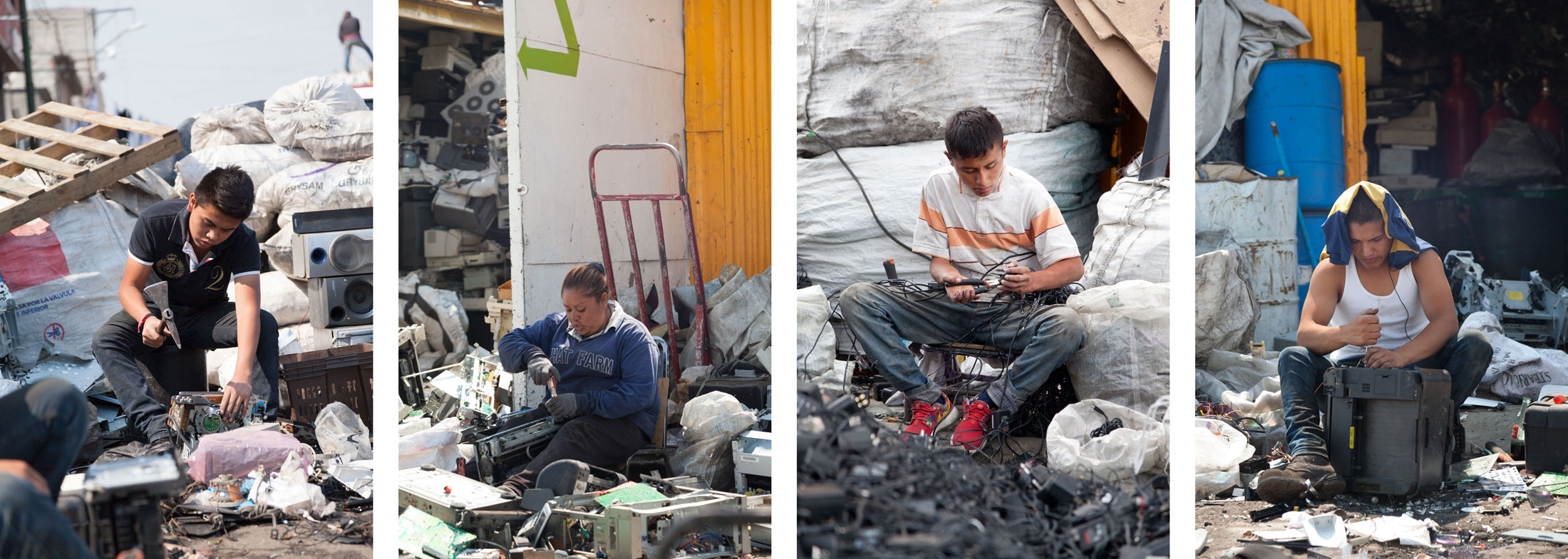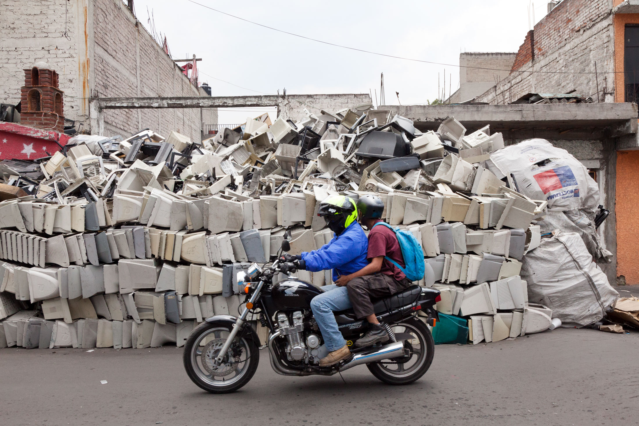 Jesús Gómez—El Tanque to anyone who knows him—navigates around 60 tons of junked electronics to see what’s going on outside. Sweaty young men have just dumped two huge sacks of spent Motorola cable-TV boxes on the street here, in Colonia Renovación, a neighborhood in Mexico City. Gómez watches as eight men and a woman sit in a circle under an intense sun, breaking the boxes apart with ball-peen hammers and chisels. They work to the beat of banda, Mexico’s heartthrob country music, wrenching out bits of copper, metal, and circuitry. Gómez will find buyers for all of it. Shards of metal and plastic fly. Metallic-tasting dust hangs in the air.