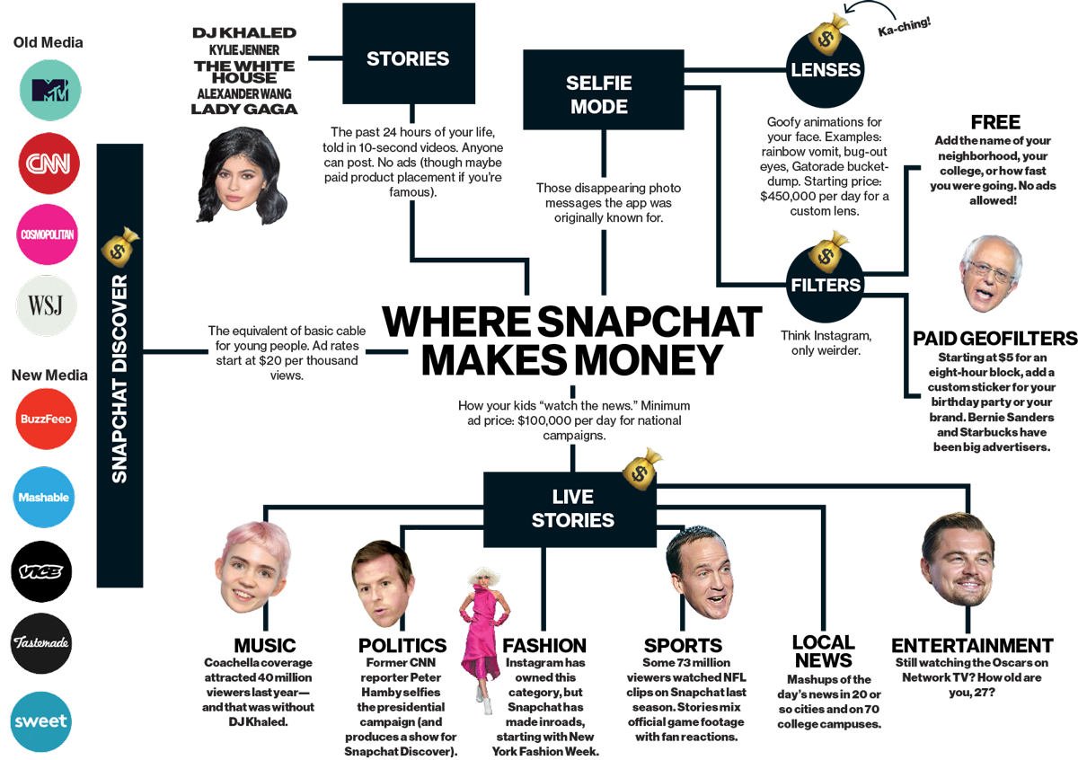 For now, that’s been enough. Advertisers don’t have a lot of good options to reach under-30s. The audiences of CBS, NBC, and ABC are, on average, in their 50s. Cable networks such as CNN and Fox News have it worse, with median viewerships near or past Social Security age. MTV’s median viewers are in their early 20s, but ratings have dropped in recent years. Marketers are understandably anxious, and Spiegel and his deputies have capitalized on those anxieties brilliantly by charging hundreds of thousands of dollars when Snapchat introduces an ad product. OMD’s Winkler calls this a “shrewd strategy” that “instantly elevates the conversation—often to the CMO level,” which means that Snapchat ad buys are often subject to less budgetary scrutiny than normal. “Every CMO’s kid is using it,” says Starcom’s Seifer.