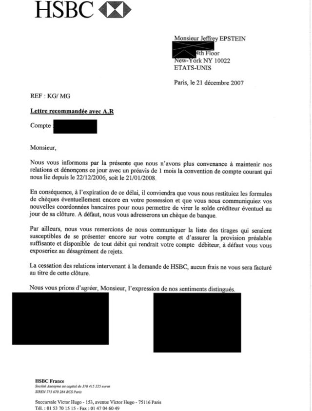 In its letter, HSBC instructed Epstein to provide the bank with “the list of drawn checks which may still be presented for payment on your account, so as to keep sufficient and useful amount in order to avoid your account to become in debit.”