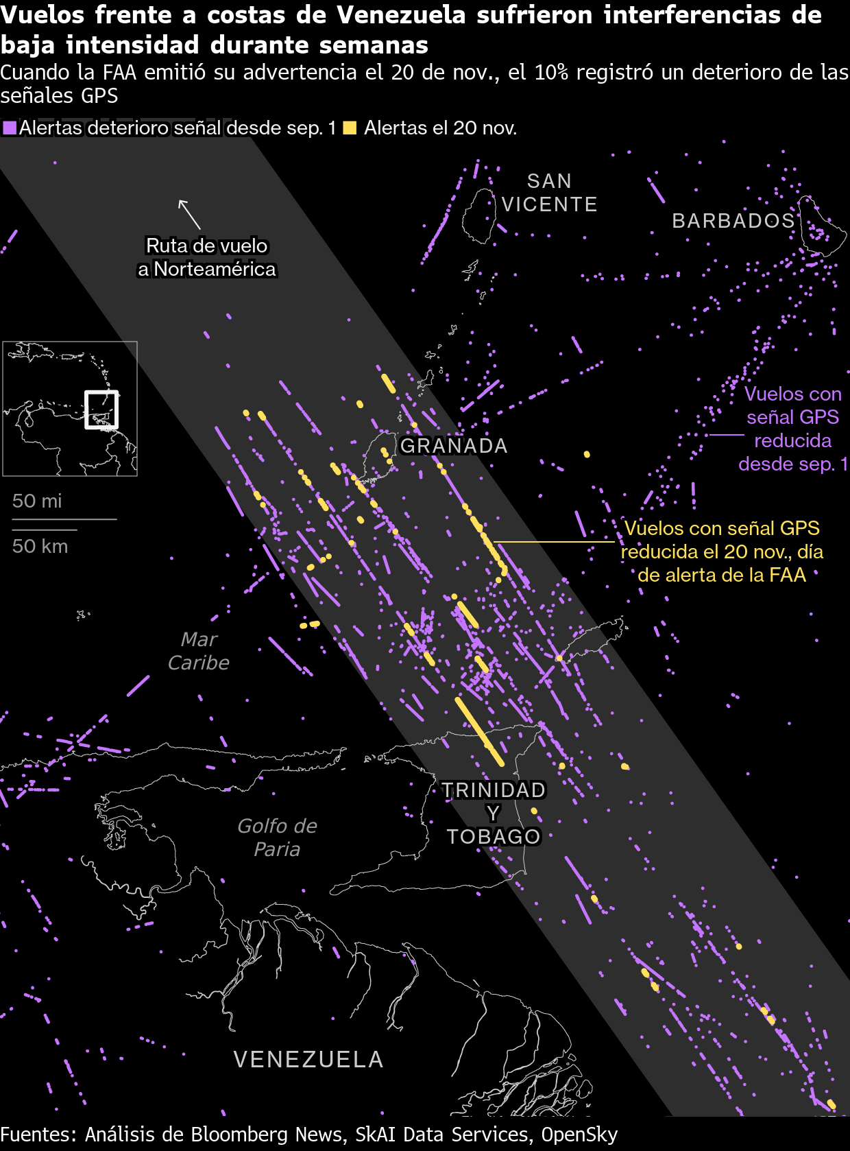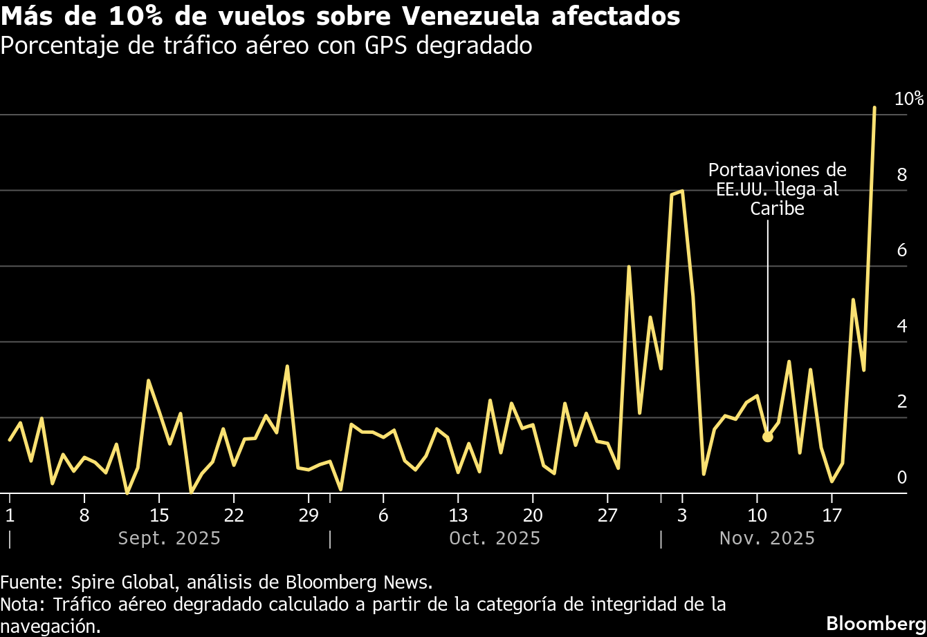 Como resultado, los cielos del país se han convertido cada vez más en una zona prohibida para los aviones comerciales. La Administración Federal de Aviación de EE.UU. (FAA, por su sigla en inglés) emitió una advertencia crucial a los pilotos el 20 de noviembre, mencionando una “mayor interferencia”. Pero los datos analizados por Bloomberg muestran que las perturbaciones electrónicas comenzaron a aumentar semanas antes, coincidiendo con una mayor presencia naval ordenada por Trump. La interferencia ha hecho que el espacio aéreo sea prácticamente intransitable para la navegación por satélite estándar en la que se basan innumerables sistemas.