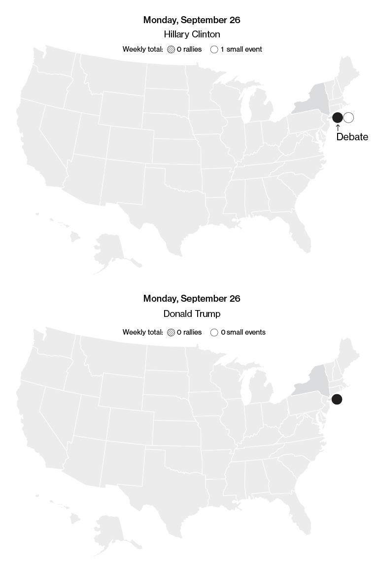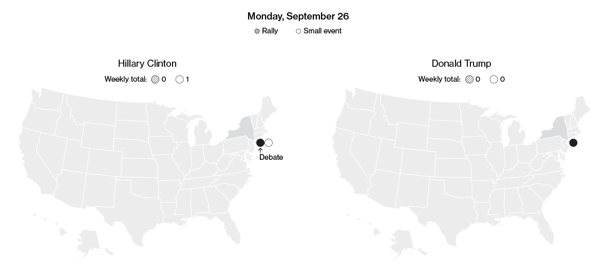 As the presidential campaign enters its final weeks, Hillary Clinton and Donald Trump are making their closing arguments in this long and bruising election. The candidates’ positions on the issues and their personal styles couldn’t be more different, and that’s true of the way they campaign, too. Bloomberg tracked every move Clinton and Trump made in the hectic week following the first debate—where they went, what they tweeted, how much they spent on ads—to see which voters they most want to win over with the precious days and dollars they have left.