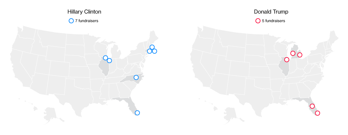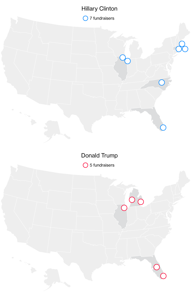 Polls and forecasts try to keep tabs on who’s leading in swing states, but if you really want to know where the campaigns expect the closest races on Election Day, look to where Clinton and Trump visit, and how often. No campaign resource is more finite than a candidate’s time, so the campaigns must carefully choose which voters get their personal attention. Trump’s first stop was to Florida for three campaign events. This reflects how important the state is to his chances of winning. Without Florida, Trump would need to sweep a handful of Midwestern swing states that have voted Democratic in recent presidential elections—explaining campaign stops in Wisconsin, Iowa, and Pennsylvania.