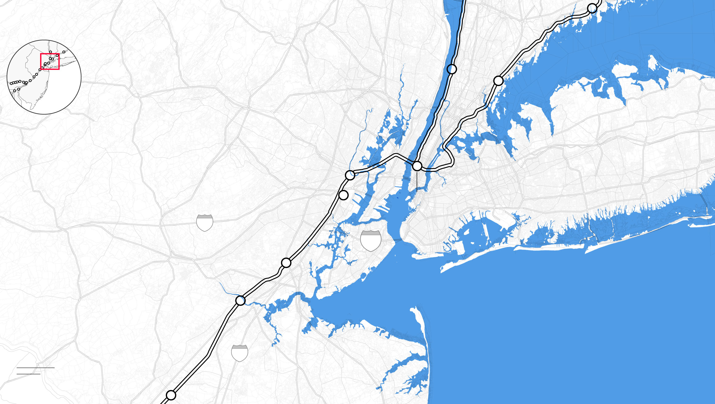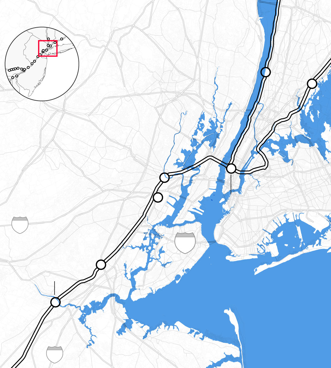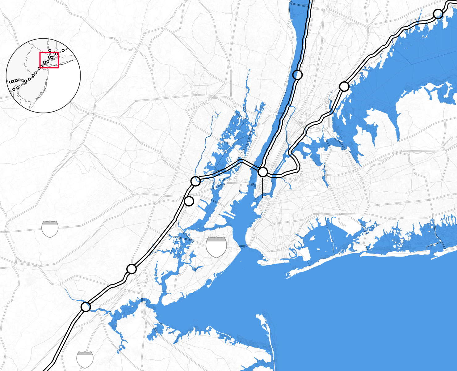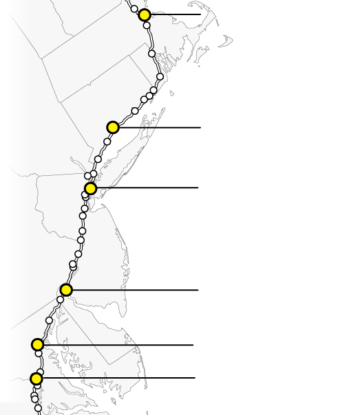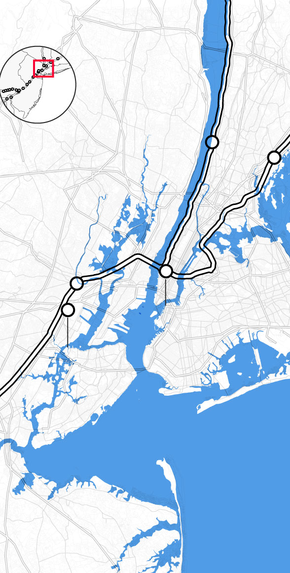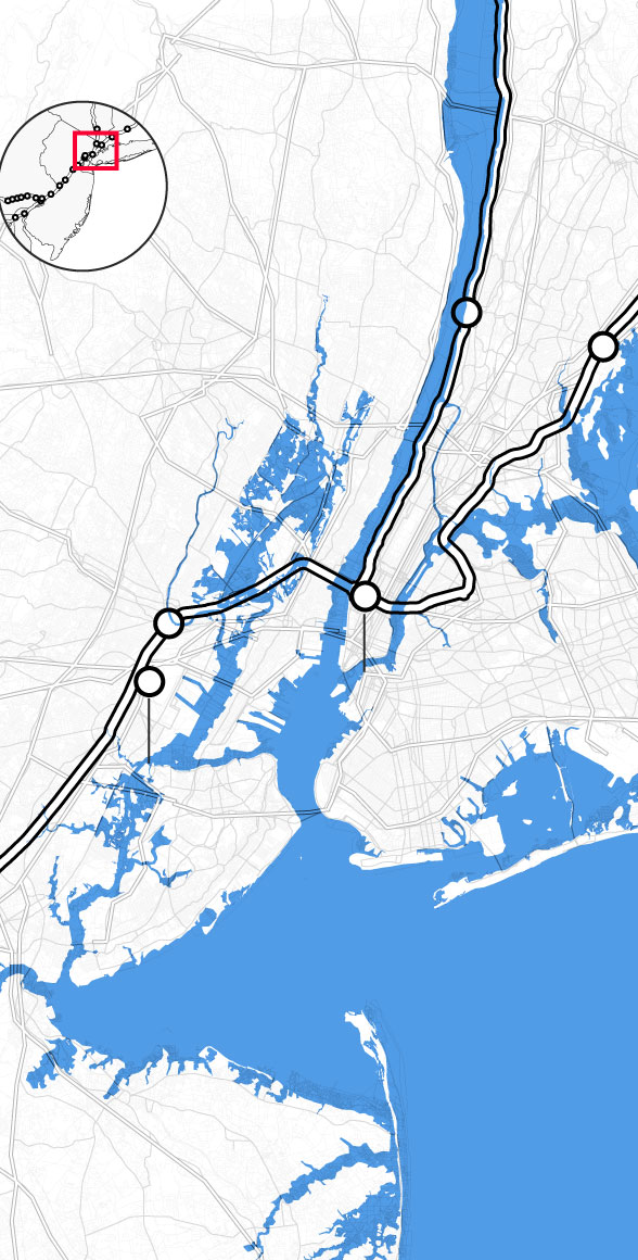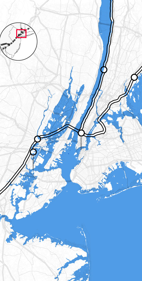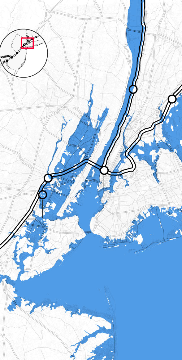 By the middle of this century, climate change is likely to punch a hole through the busiest stretch of rail in North America. Parts of Amtrak’s Northeast Corridor route, which carries 12 million people each year between Boston and Washington, face “continual inundation.” Flooding, rising seas, and storm surge threaten to erode the track bed and knock out the signals that direct train traffic. The poles that provide electricity for trains are at risk of collapse, even as power substations succumb to floodwaters. “If one of the segments of track shuts down, it will shut down this segment of the NEC,” warned members of Amtrak’s planning staff. “There is not an alternate route that can be used as a detour.”