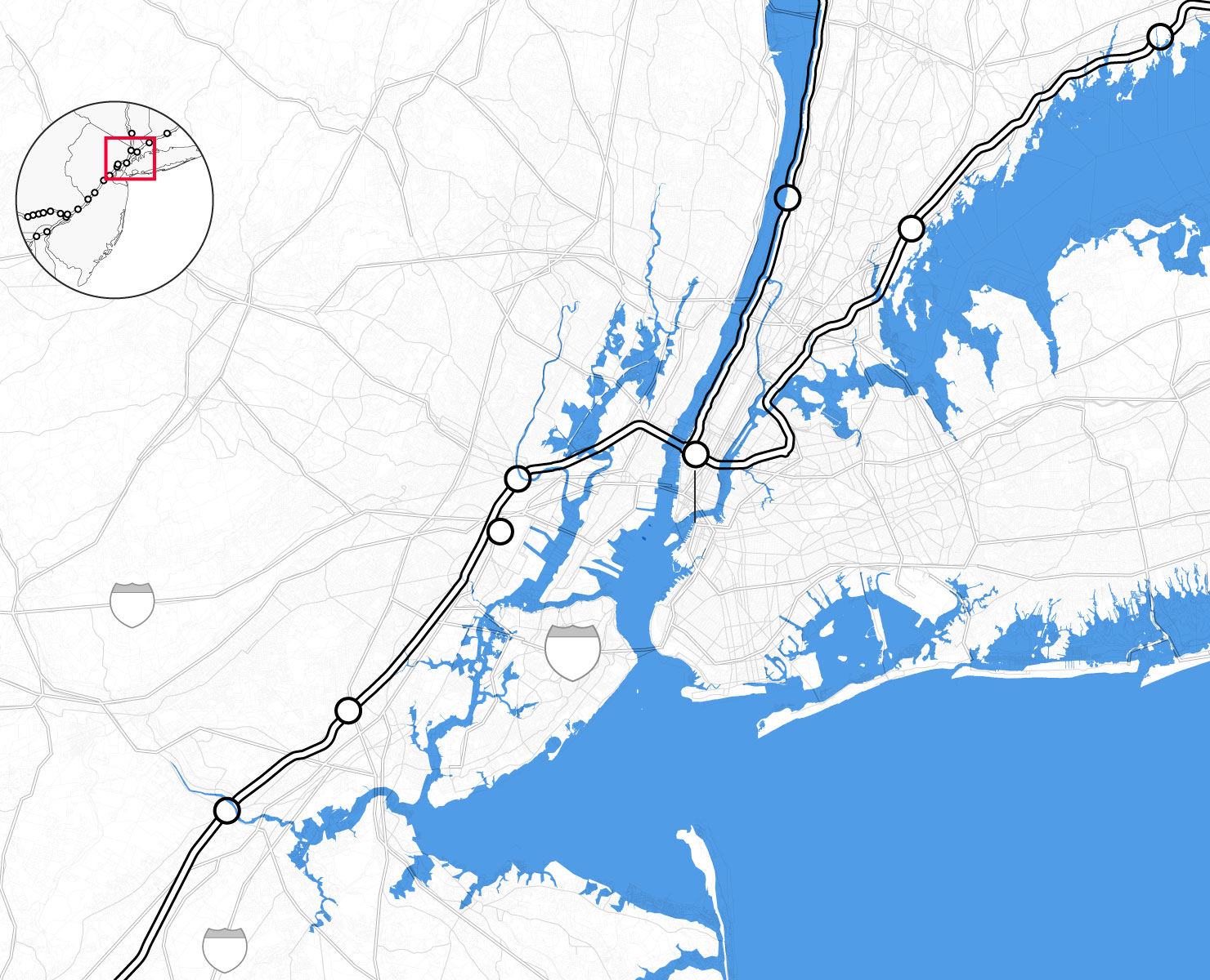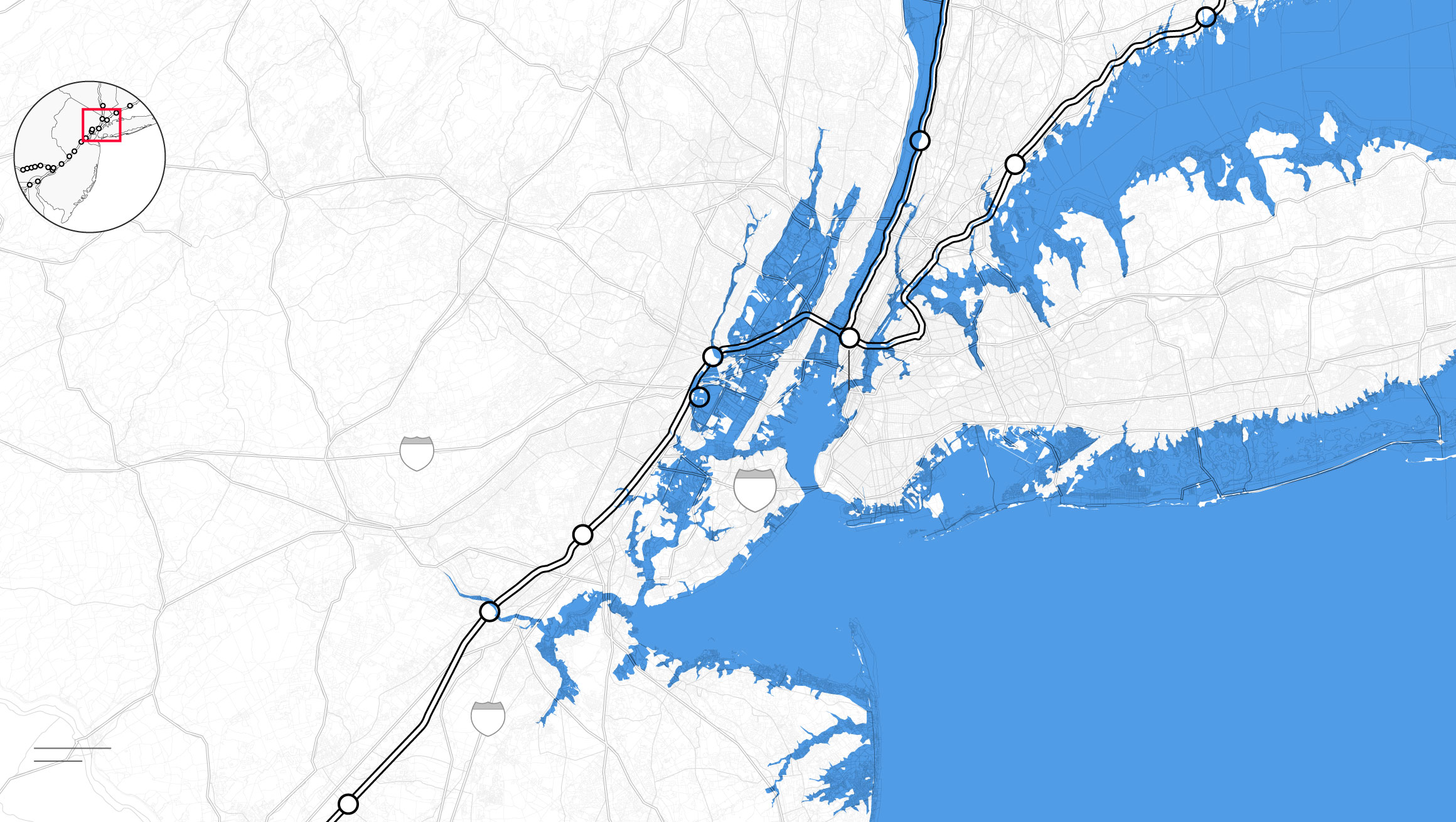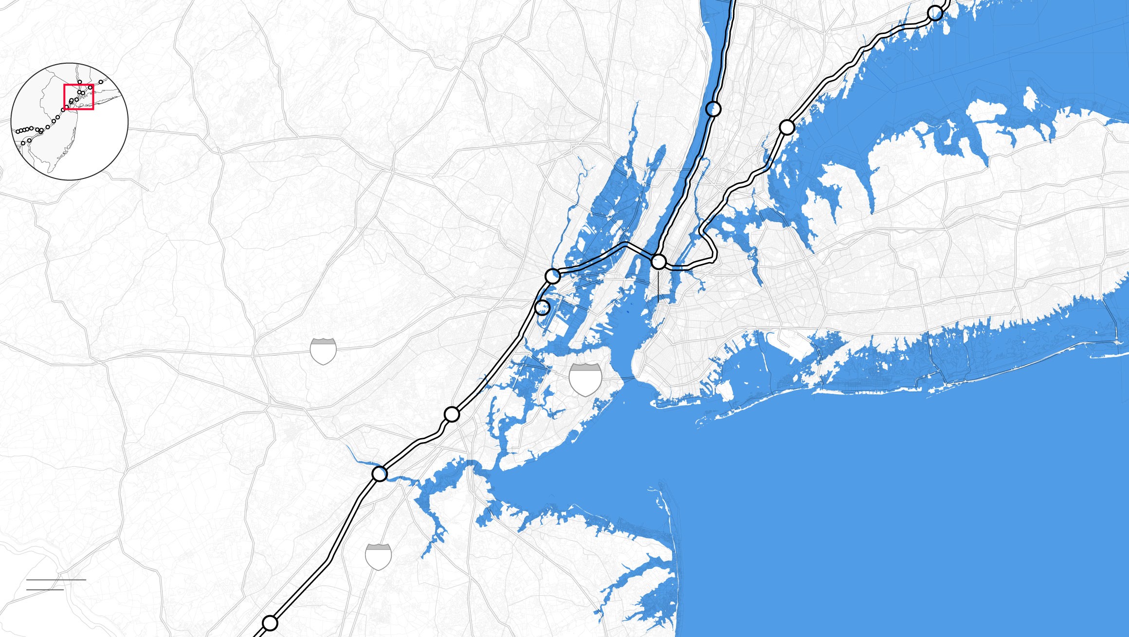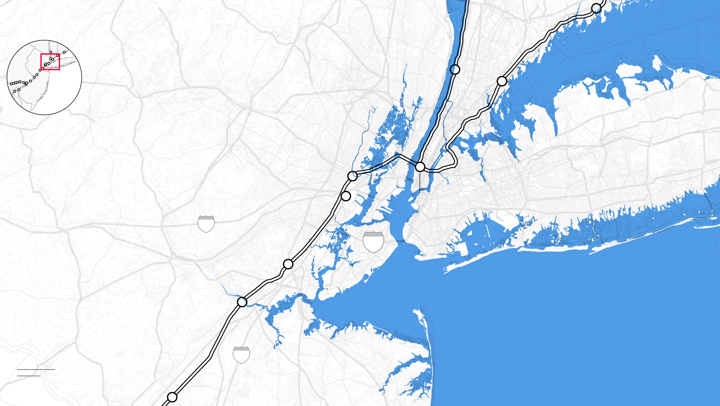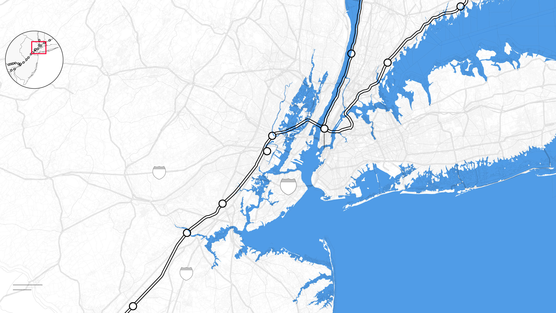 By the middle of this century, climate change is likely to punch a hole through the busiest stretch of rail in North America. Parts of Amtrak’s Northeast Corridor route, which carries 12 million people each year between Boston and Washington, face “continual inundation.” Flooding, rising seas, and storm surge threaten to erode the track bed and knock out the signals that direct train traffic. The poles that provide electricity for trains are at risk of collapse, even as power substations succumb to floodwaters. “If one of the segments of track shuts down, it will shut down this segment of the NEC,” warned members of Amtrak’s planning staff. “There is not an alternate route that can be used as a detour.”