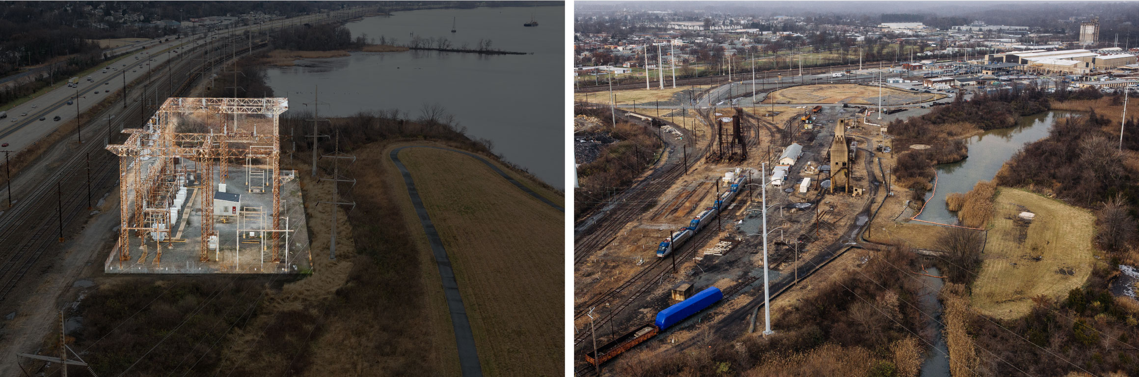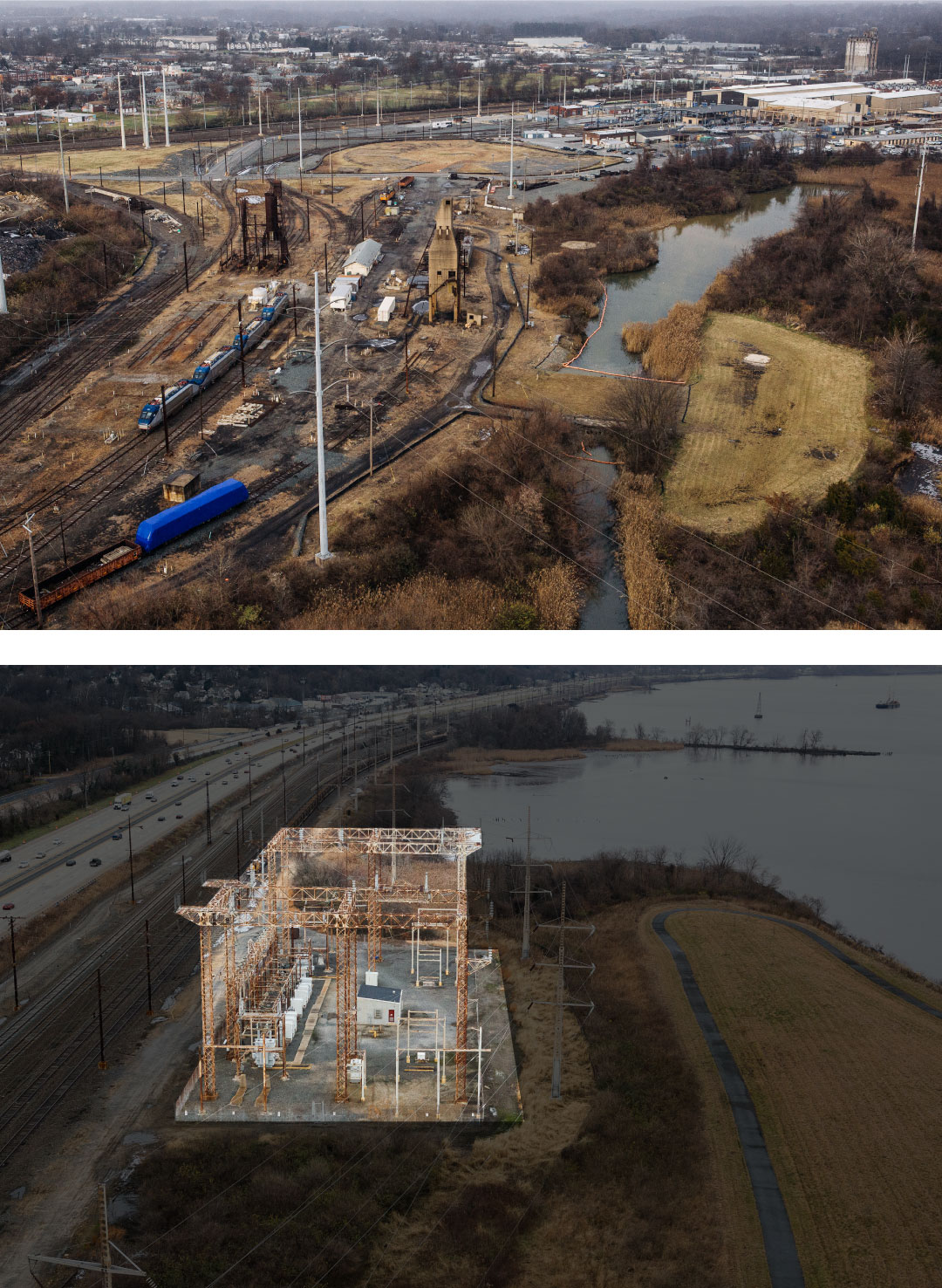 LeftTop: The Bellevue Substation, along the Delaware River just north of Wilmington, would be under an estimated one-and-a-half feet of water following a 500-year storm in 2050. RightBottom: The 96-acre Wilmington Maintenance Yard, one of the few in the country that can repair electric locomotives, would be almost entirely underwater following a 100-year storm in 2050. Photographer: Michelle Gustafson for Bloomberg