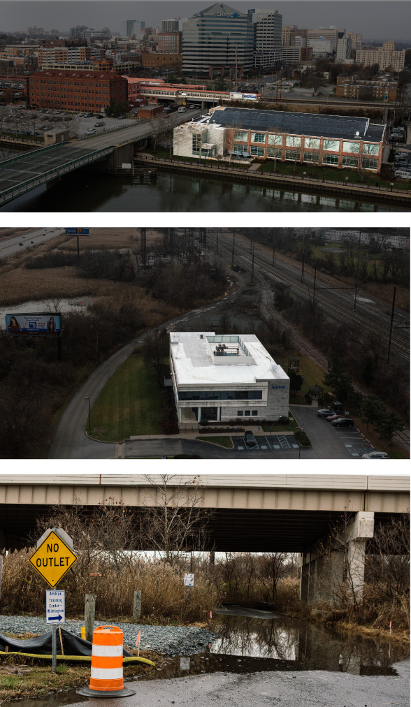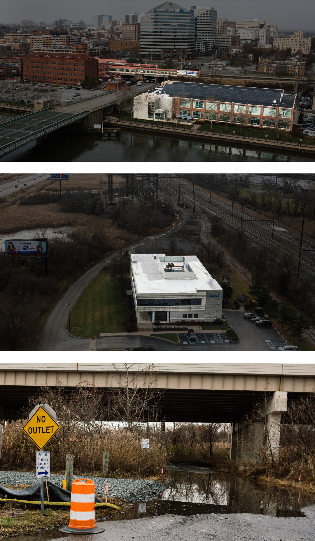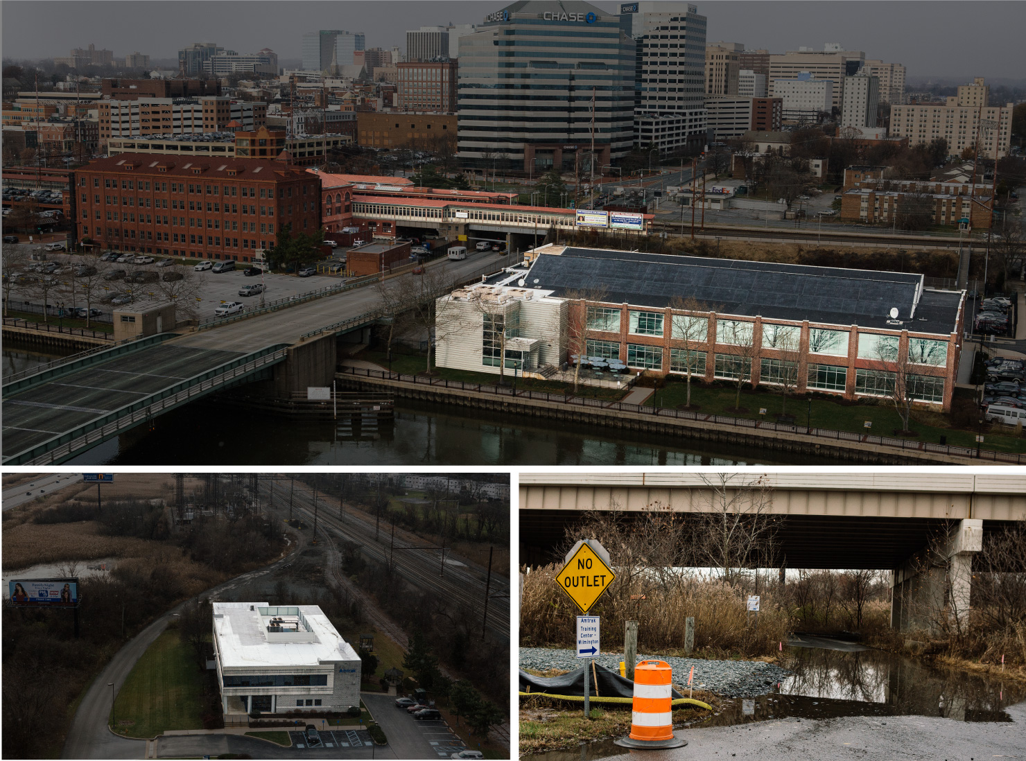 Top: Amtrak's Consolidated National Operations Center, which monitors and controls rail traffic around the country, is likely to get five feet of water during major storms by 2050, according to an internal report. The adjacent Wilmington Station can also expect four feet of water. Bottom left Middle: The road to Amtrak's training center, where the company instructs engineers how to operate its locomotives, already floods regularly. Bottom right: The training center. Photographer: Michelle Gustafson for Bloomberg