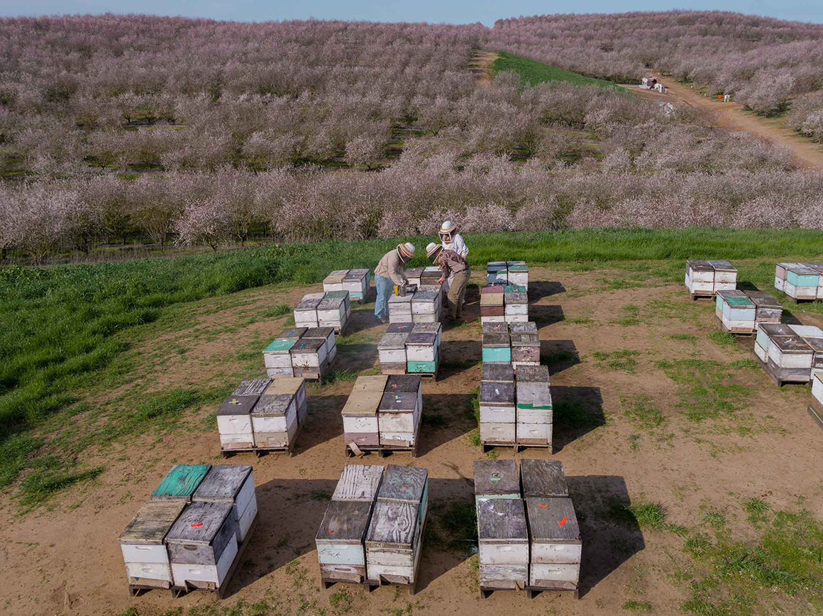 Before the drought, the big concern for almonds was the supply of pollinators. Honeybees began dying in alarming numbers in 2006 due to a phenomenon named Colony Collapse Disorder, the causes of which have never been fully explained. Beehives are now more expensive as permanently higher death rates require faster replacement of hives. But almond demand has given growers incentive to pay more for bees that are trucked in from across the U.S. to help pollinate trees, with the crop being the single biggest user of commercial pollination services. California’s bee population peaks in the first three months of the year—last year’s 1.44 million hives accounted for more than half of all the bees in the U.S., and double the number that had been in the state the previous July.