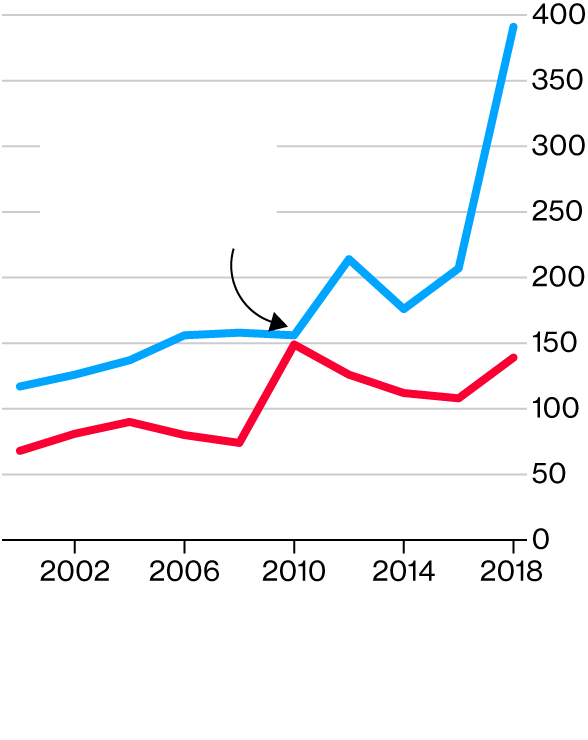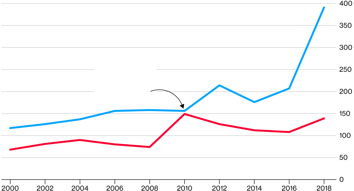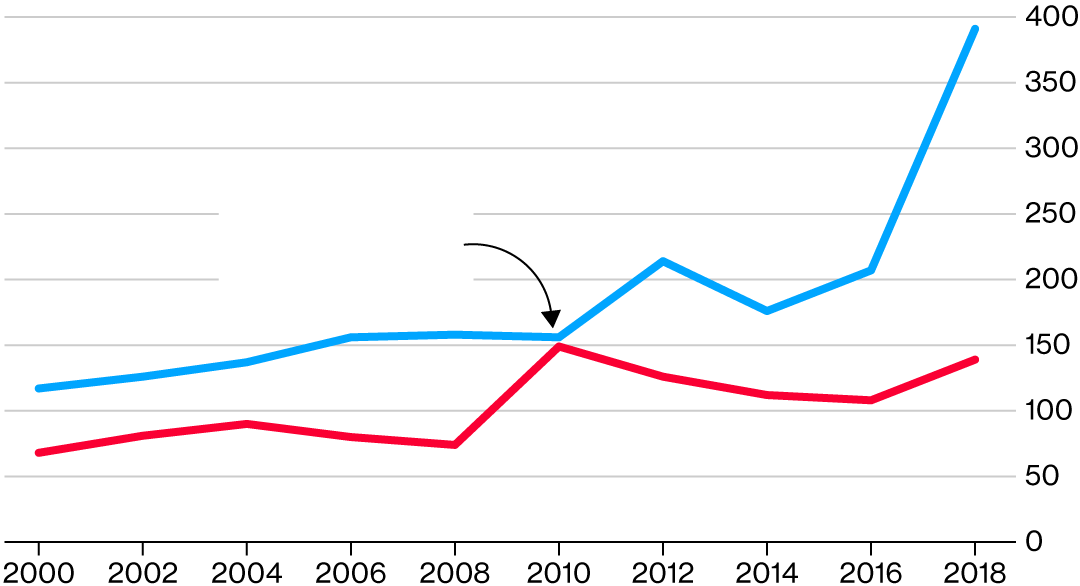 As recently as 2010, the split between parties was nearly even