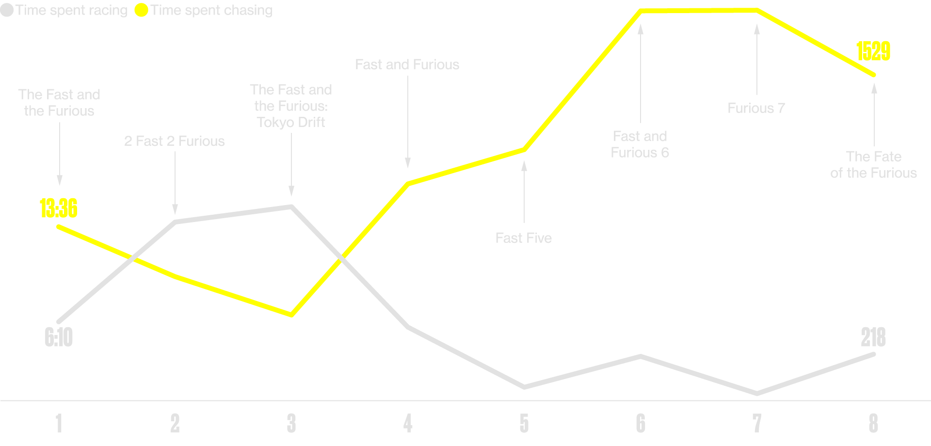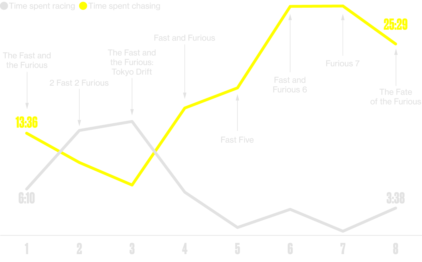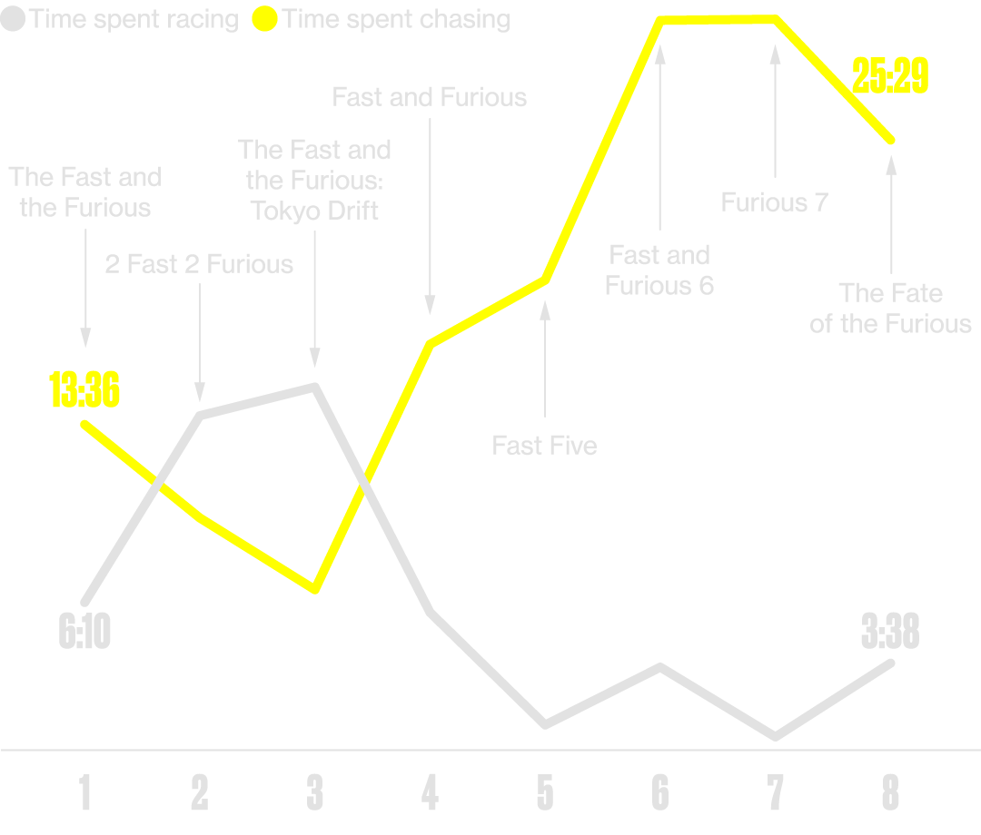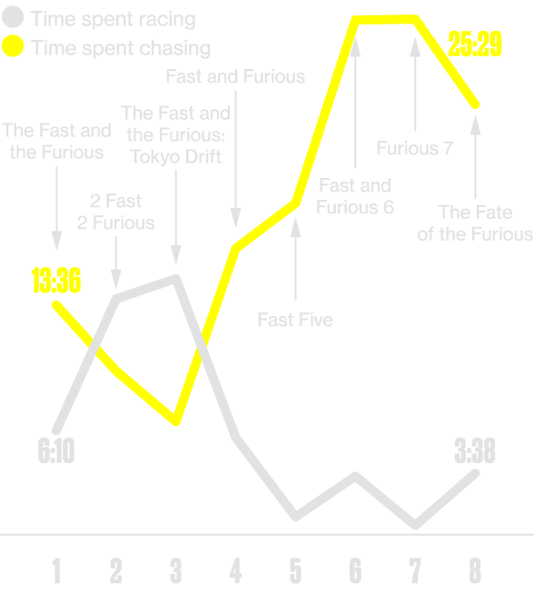 This measures the length of any race involving motorized vehicles (cars, jet skis, etc.), including, but not limited to, formal competitions between two or more drivers, impromptu street races, and individual time trials for racing or drifting. For races that don't conclude with a scene shift, racing time ends when the competition appears to conclude. A formal race between two people ends when the winner crosses the finish line. A formal race among more than two people, on the other hand, might end when the penultimate finisher crosses the finish line if the other losing racers fail to finish. Also included in this metric are any midrace pauses in which racers stop momentarily and stare one another down or flashbacks occurring prior to a race. Scenes that include a live video feed of a race are included in the tally of racing time; scenes in which characters review previously recorded race footage are excluded. Race-like competitions such as a demolition derby are also included in racing time.