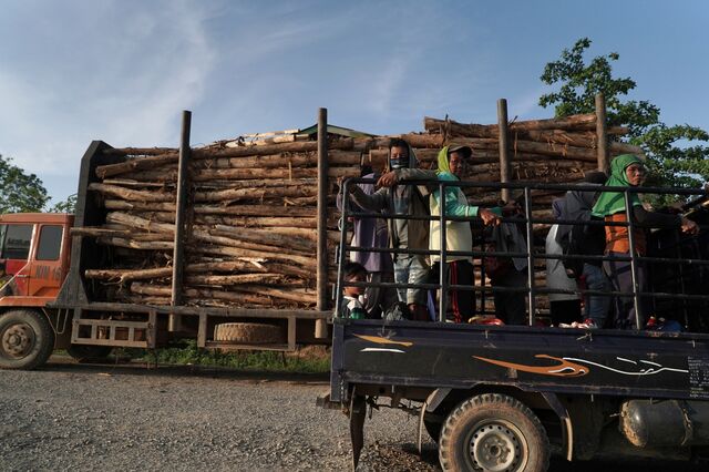 Workers on the back of a pick-up pass a logging truck in Penajam, near Balikpapan. While the region has relied on its natural resources for a century, the new capital would dramatically change the local economy.