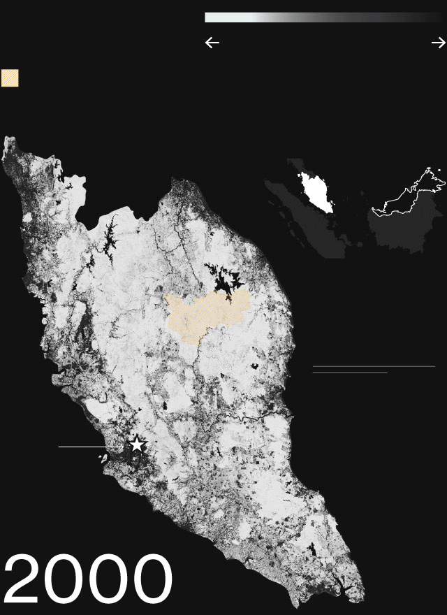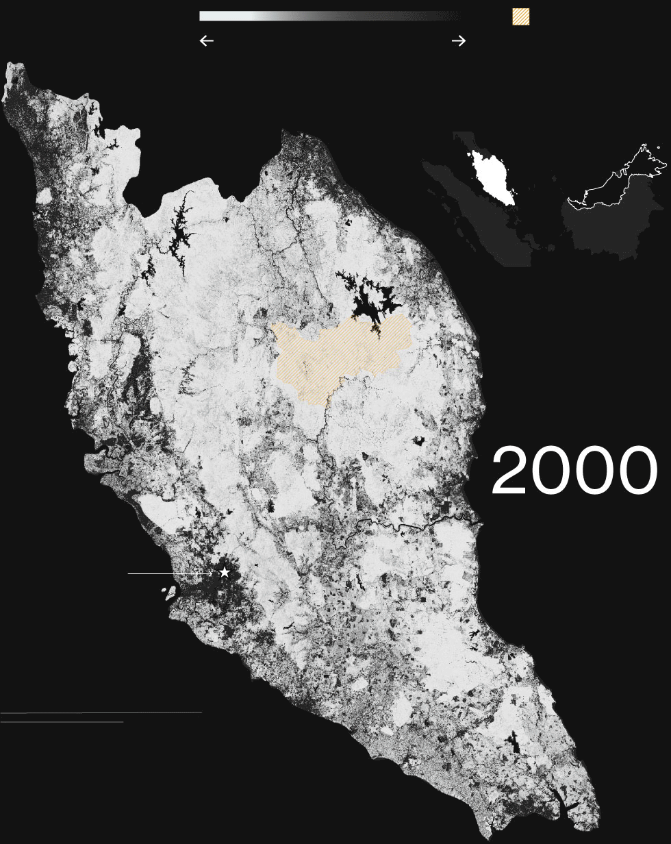 Southeast Asia, where widespread logging and commercial plantations have operated for almost a century, is a prime example of a region where all these forces are at work. Western Malaysia has dealt with them longer than most. Situated on a peninsula stretching south toward Singapore, its agricultural areas were largely confined to the coast through the mid-19th century. After the British brought rubber trees from Brazil in 1877, plantations expanded inland. Oil palms brought to Malaysia from West Africa around the same time were originally considered ornamental trees, but as rubber prices declined in the mid-20th century, the newly independent government began to push the expansion of palm oil to increase revenue from exports. By the 1990s the palm oil era was in full swing.