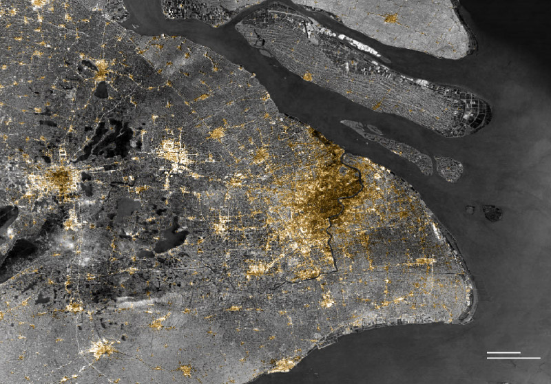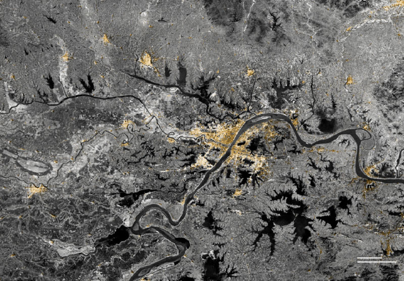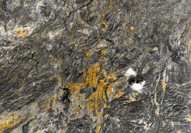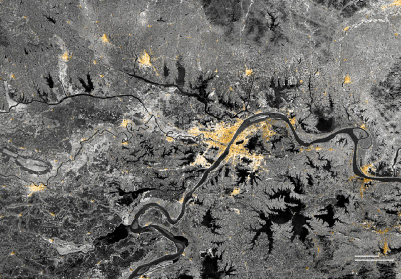 Sources: Global Human Settlement, European Commission (2000, 2014); Esri 2020 Land Cover; aerial images from Bing Maps