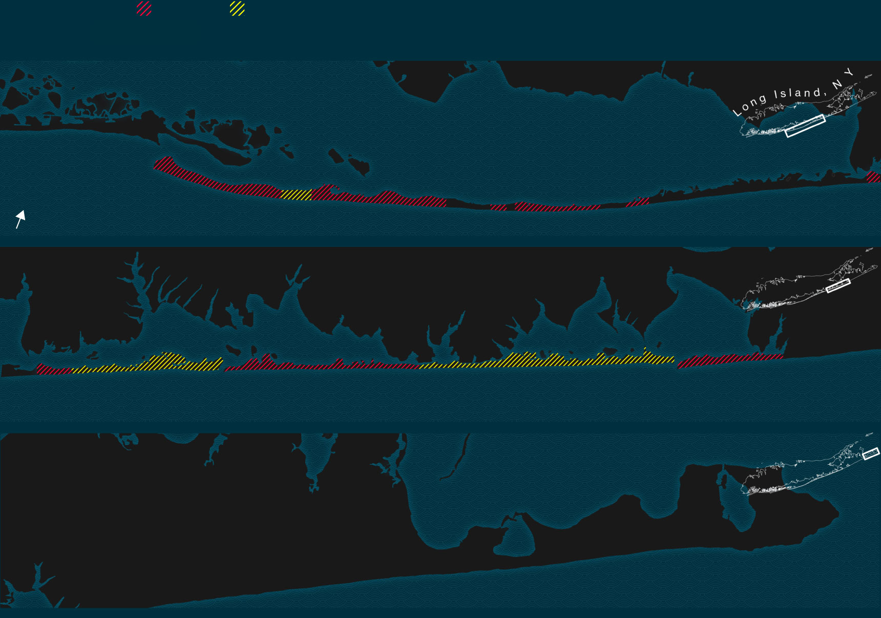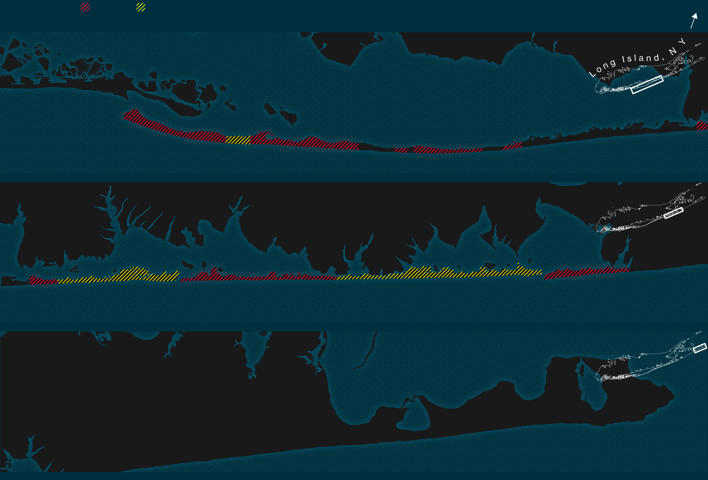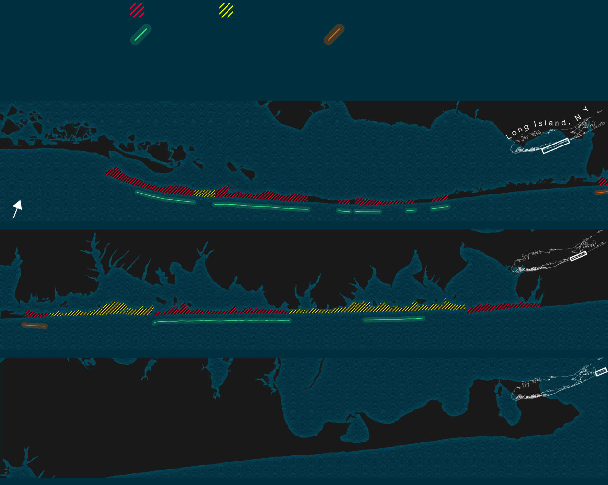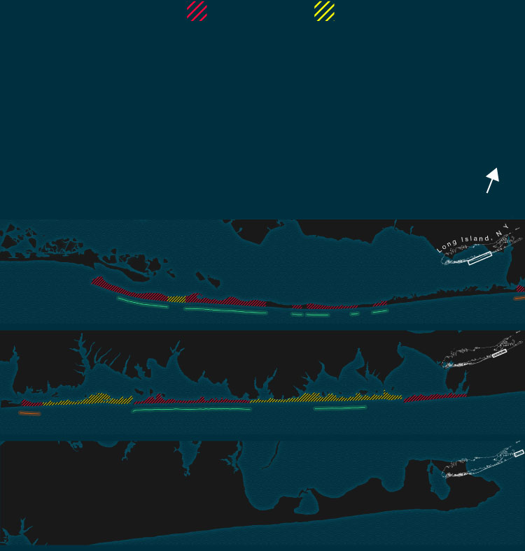 The Corps proposed building the first jetty at the west end of the Hamptons, then moving east. That’s because the prevailing currents off Long Island move counterclockwise, from east to west, effectively conveying sand in that direction. When a jetty interrupts the flow, sand builds up along its eastern edge. Any beach behind the jetty will be at greater risk of erosion.