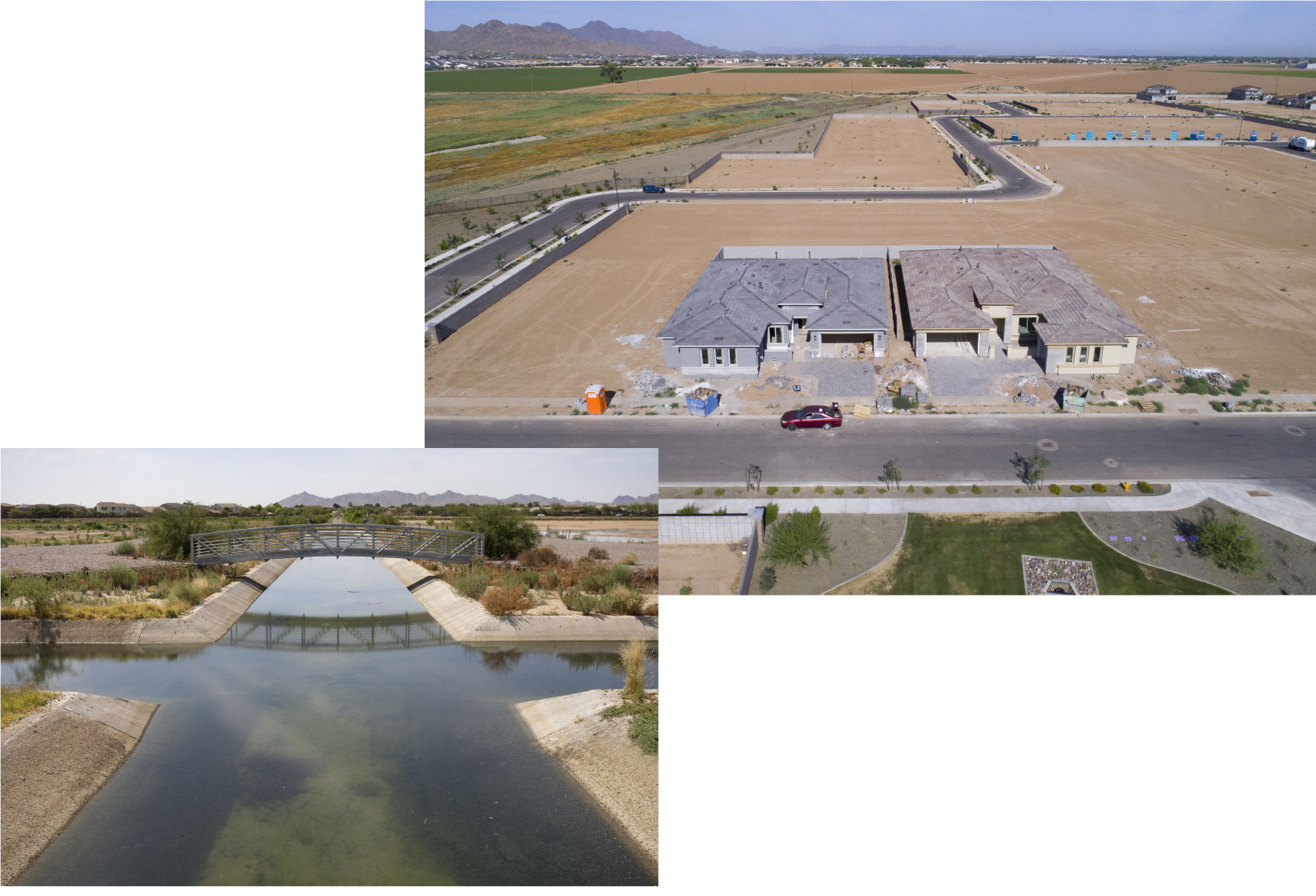 Green fields and desert scrub abut new
