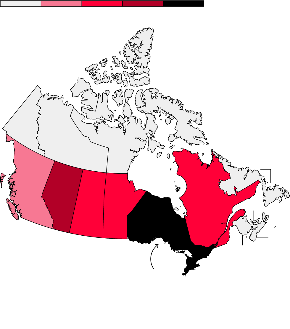 Over the same two decades, the country’s annual rate of shootings per capita — incidents referred to as “discharge firearm with intent” — surged almost sevenfold. In Saskatchewan, which saw the highest increase, that rate exploded 35-fold since 2003 and is now nearly five times the national average, according to a Bloomberg analysis of national crime data. These concurrent trends — more guns, more shootings — have alarmed Canadian authorities.