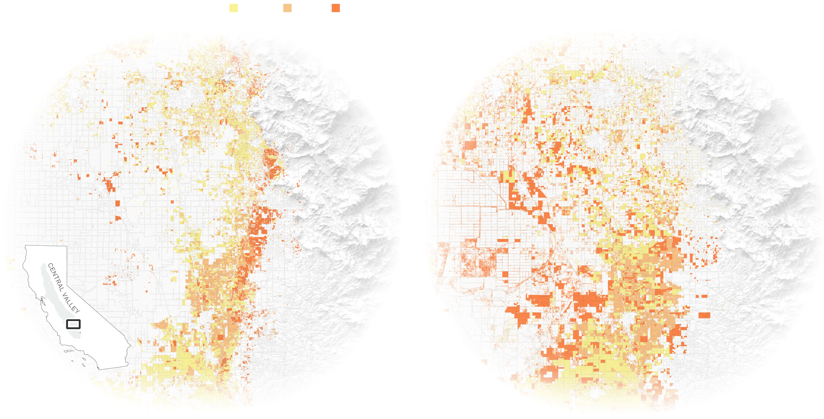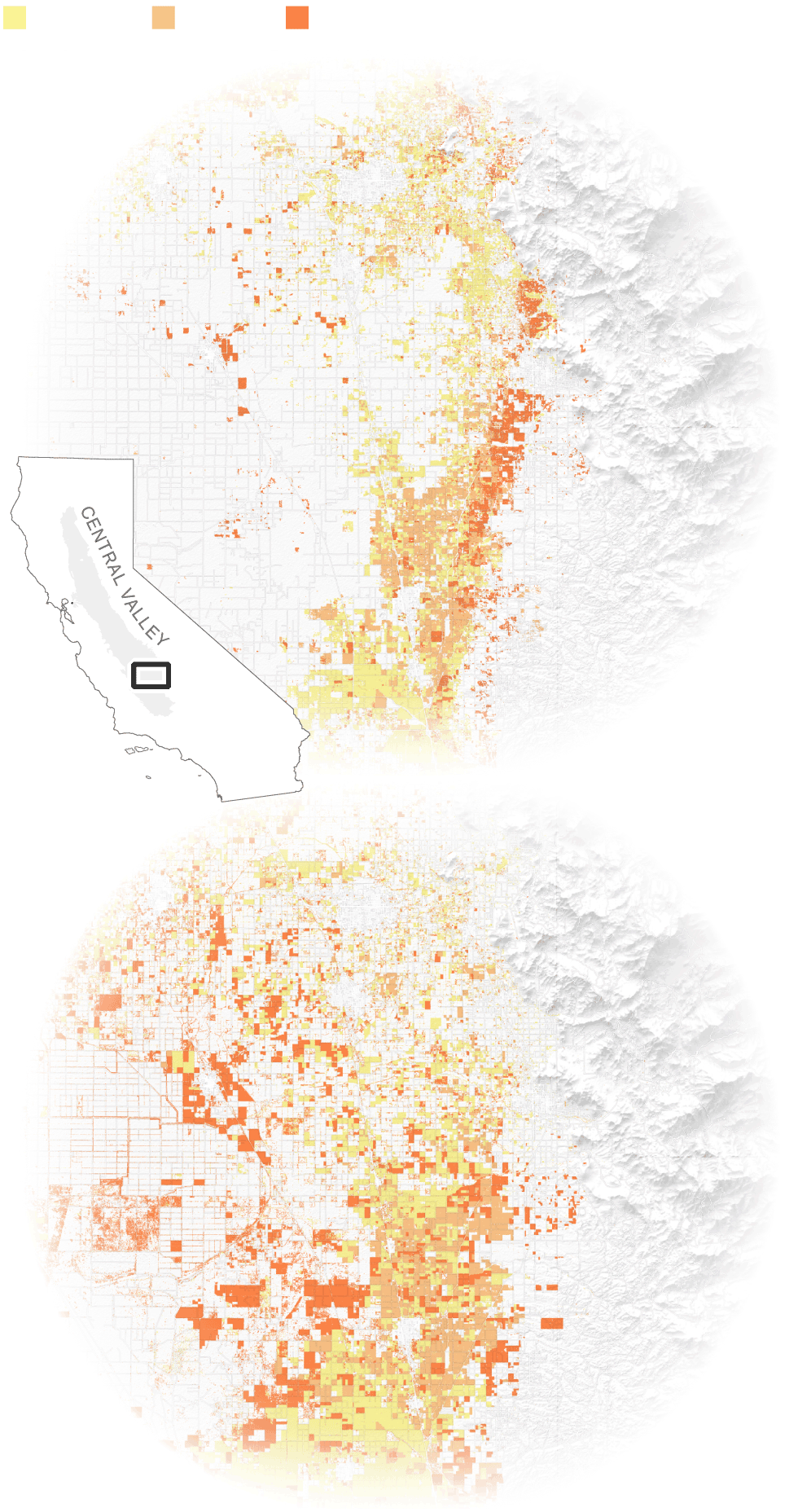 It’s impossible to apportion blame, between drought and deep extraction, for any one well’s demise. Most of California’s failed water systems are a result of contamination—often a consequence of rampant agricultural drilling, propelled by drought. Deep wells suck surface contaminants such as nitrates from farm runoff down into the aquifer, where the plumes, at higher concentrations because of drought, are pumped into household and community water systems. Tapping deeper groundwater for drinking supplies isn’t an option for poor communities, as it can cost about $350,000 to drill a 1,000-foot well. It’s also dangerous. Beneath about 600 feet, many Central Valley water basins contain arsenic, a naturally occurring carcinogen.