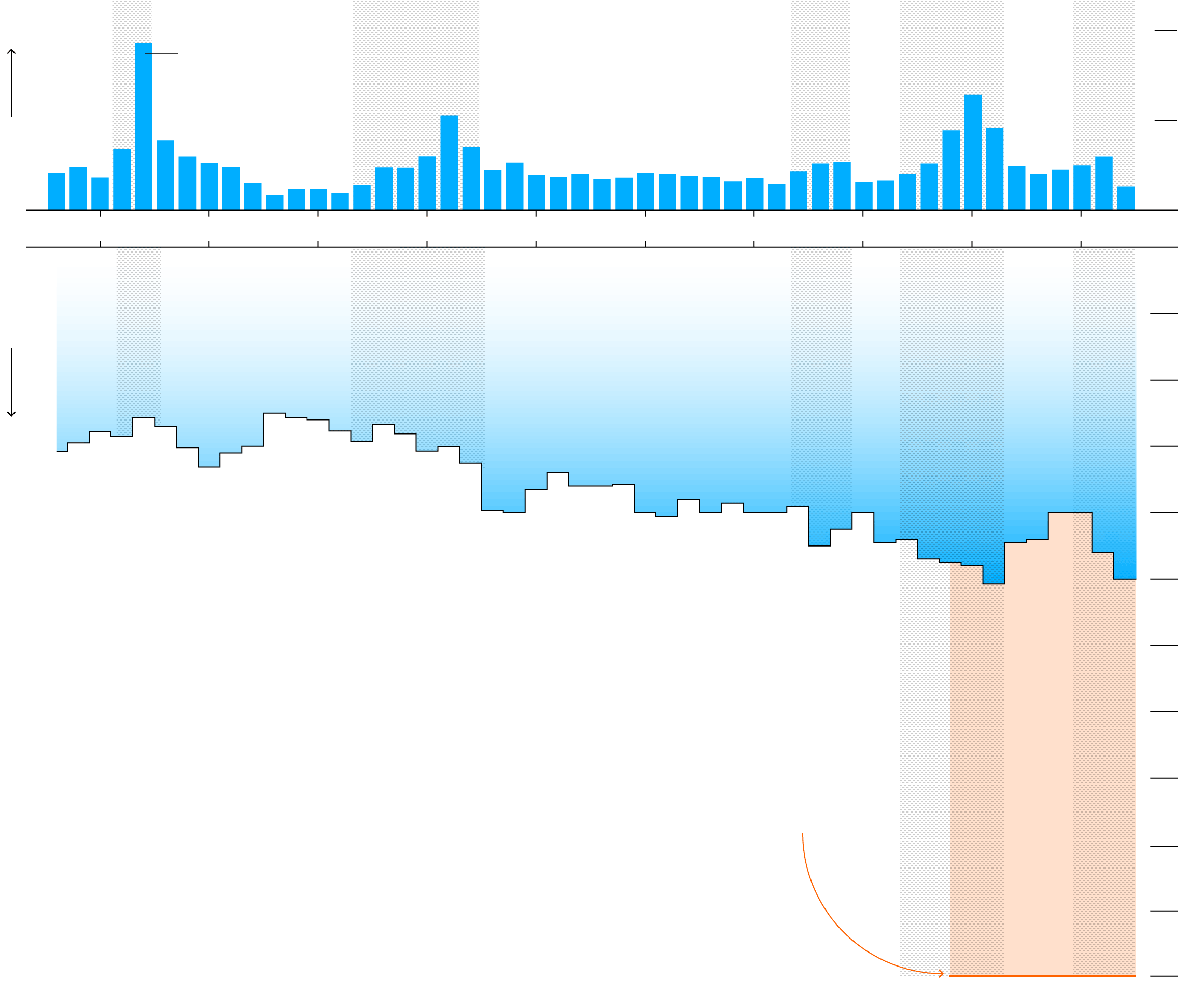 Subsidence also poses a serious risk to the California Aqueduct, the 440-mile canal that carries water from the Sacramento-San Joaquin Delta down the Central Valley’s west side to Los Angeles. From 2013 to 2016, overpumping dropped parts of the concrete structure almost 3 feet, according to the California Department of Water Resources, the canal’s operator. Last summer the 160-mile midsection was dropping 4 inches a year, says John Yarbrough, assistant deputy director of DWR’s State Water Project.