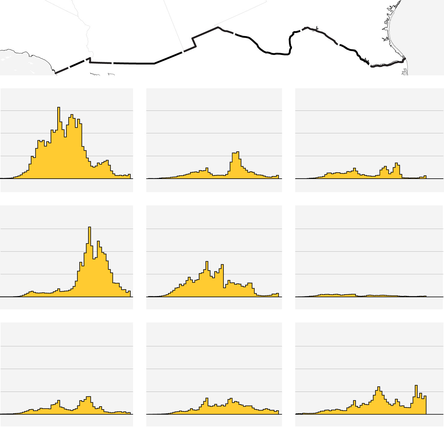 Many miles of border don’t have a man-made barrier but lie in mountainous areas or along the Rio Grande River, which provide a natural obstacle to both migrants and wall construction efforts.
