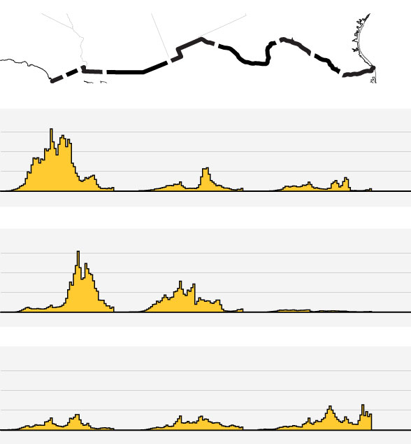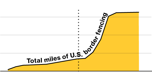 There was a significant drop in apprehensions after fencing was built near San Diego in the early 1990s. The drop there was followed by a spike in apprehensions to the east, near Tucson, Arizona, where the border was less fortified. When fencing was extended across much of the Arizona border, apprehensions fell there, too. Now apprehensions are highest in the Rio Grande Valley Border Patrol Sector in southern Texas. Much of Texas lacks fencing, though there is some in the Rio Grande Valley.