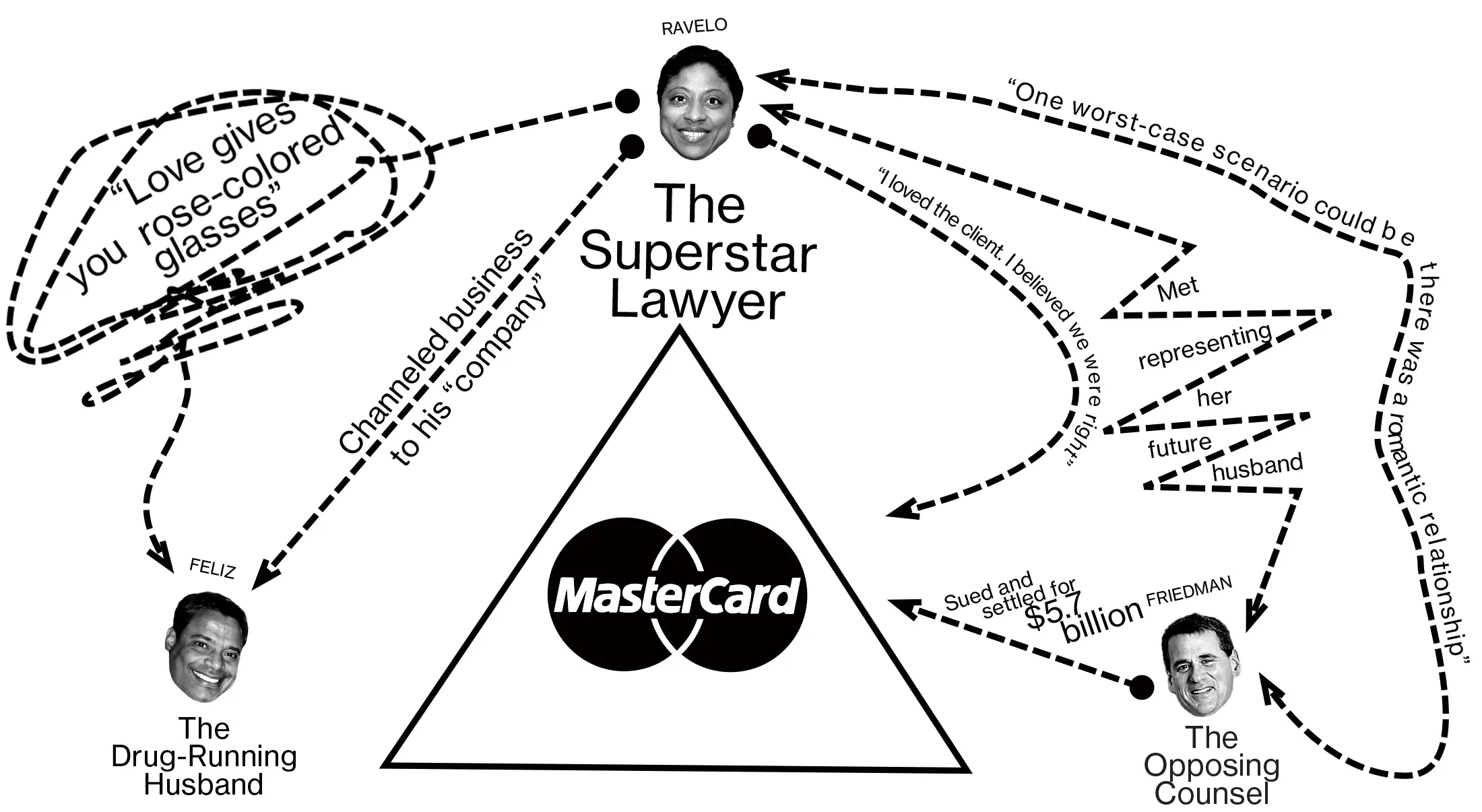 Ravelo, 50, had never been arrested before. A partner with the elite New York corporate law firm Willkie Farr & Gallagher, she’d built a successful career as a litigator, primarily representing MasterCard against waves of price-fixing lawsuits filed by retailers. In one credit card case, she helped negotiate a $5.7 billion truce—the largest settlement of an antitrust class action in the world. Earning more than $2 million a year, she favored Hermès handbags and diamond jewelry. She owned a Bentley Continental Flying Spur sedan and sent her teenage sons to a high-priced boarding school in Florida. Feliz, 49, had a varied past that included stints in real estate, paralegal work, and narcotics trafficking.