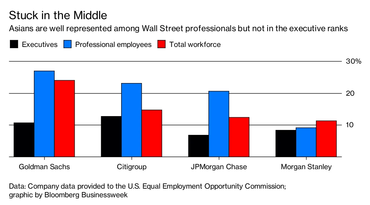 Asian Americans get hired at a much higher rate than their proportion of the general U.S. population but that doesn't mean they're climbing the executive ranks at the same pace. Across corporate America, Asians make up 12 percent of professionals and 5 percent of executives, according to Equal Opportunity Commission data. In finance, four of the biggest U.S. banks have less than 15 percent of their Asian workforce in C-suites or upper management.