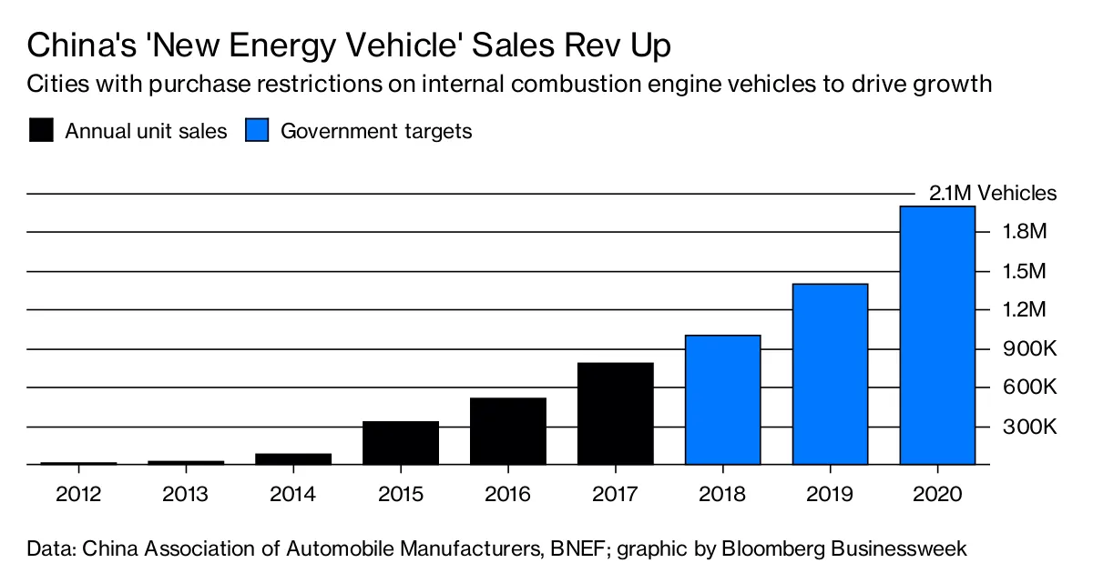 High-level Chinese government support for so called new energy vehicles, which include plug-in hybrids, battery electric, and fuel cell vehicles, is set to drive an annual sales increase of almost 30 percent to 1 million units in 2018 and 2 million units by 2020. The Minister of Science and Technology expects 5 million cumulative NEVs on its roads by 2020. Even with a subsidy cut for new energy vehicles expected in the second quarter of this year, robust demand will come from cities with purchase restrictions on internal combustion engine vehicles, according to Bloomberg New Energy Finance.