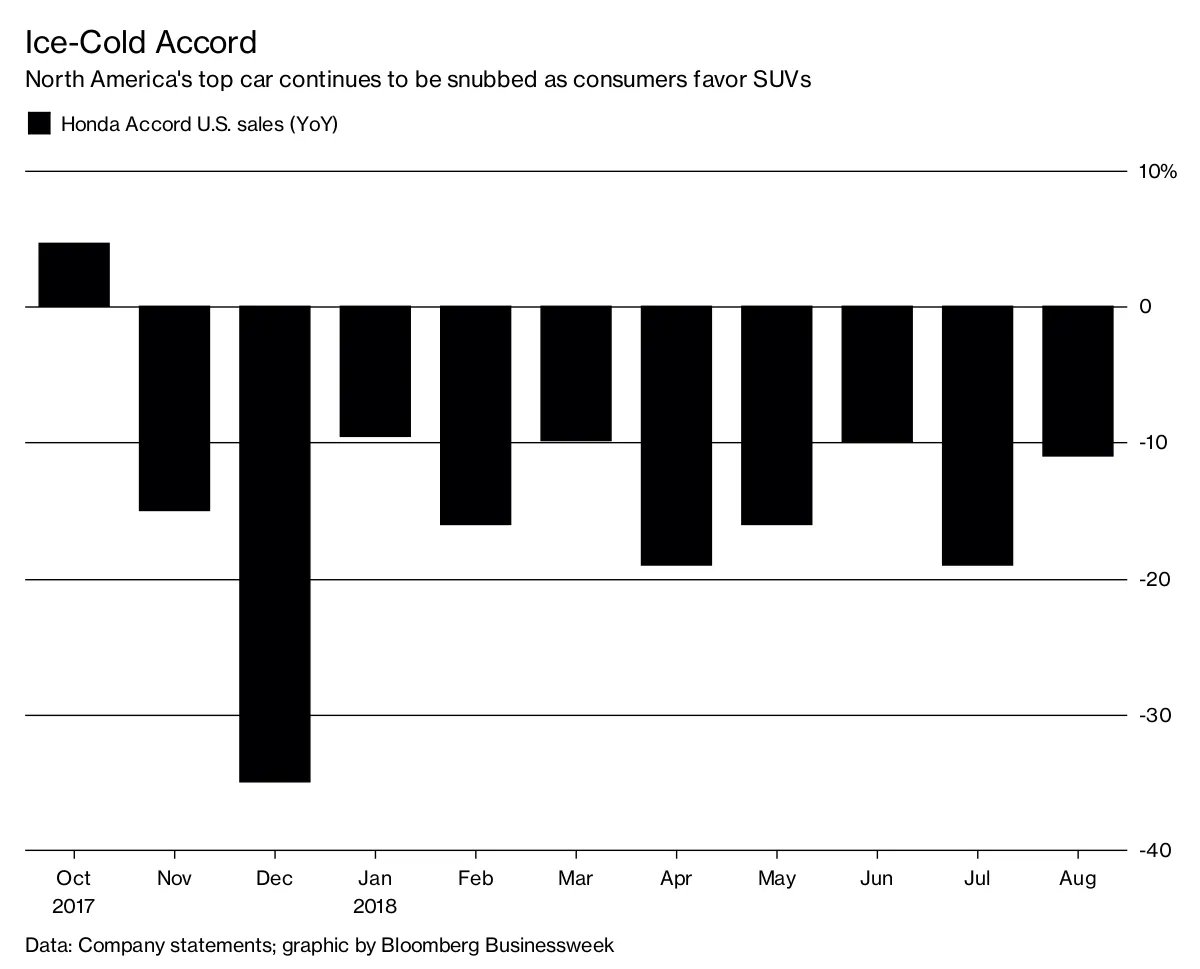 Honda Motor Co.’s Accord extended its stretch of consecutive U.S. sales declines to 10 months in August. The dismal run for the award-winning model shows just how swiftly consumer demand has shifted to sport utility vehicles and away from sedans, which also slumped at Toyota Motor Corp. and Ford Motor Co. Honda’s total deliveries rose 1.3 percent last month, trailing analysts’ 2.2 percent average estimate.