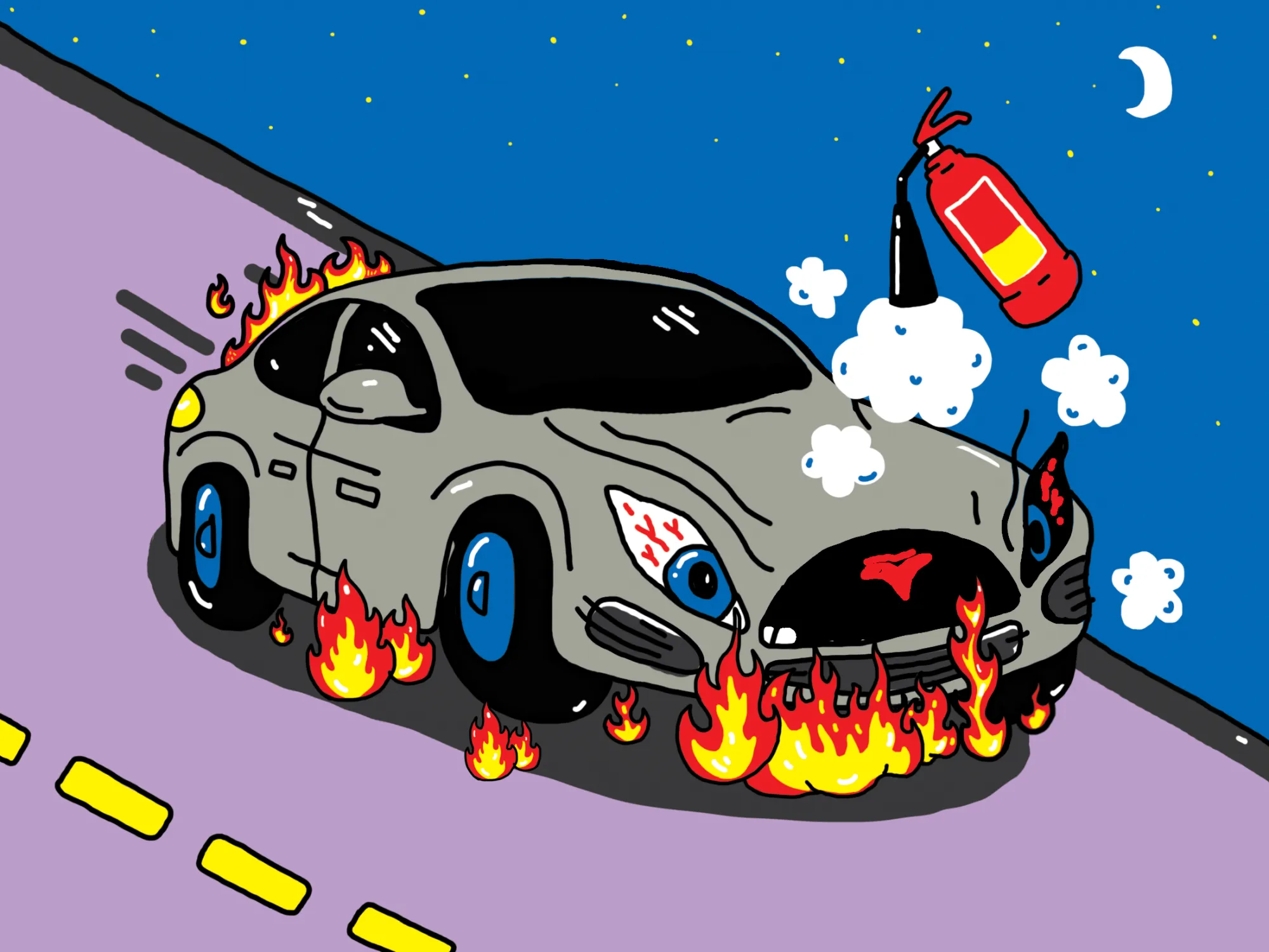 After an out-of-control Tesla Model S plowed into a stand of palm trees on a highway median outside Fort Lauderdale last month, police rushed to put out the ensuing blaze using a department-issued fire extinguisher. It was a wasted effort. The car kept on burning after the crash, which killed the driver.
