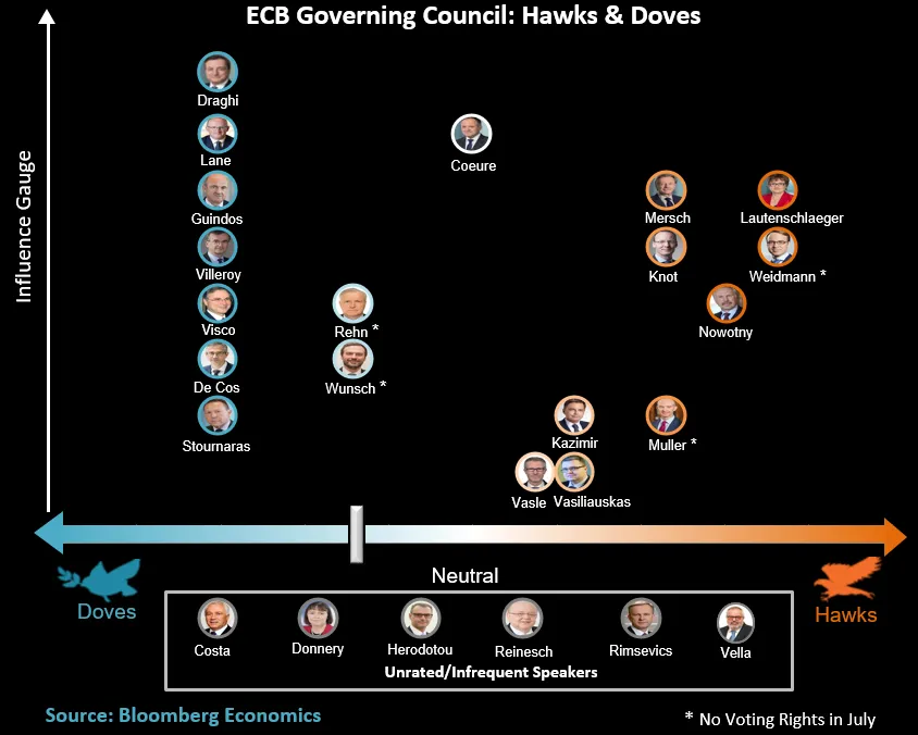 European Central Bank President Mario Draghi is poised to restart stimulus before the end of his term in October, potentially leaving his successor, Christine Lagarde, to take up the baton if necessary. The Bloomberg Economics ECB spectrometer shows a dovish shift, with policy maker Olli Rehn warning the slowdown isn’t temporary and Klaas Knot saying it is “indisputable” that inflation is too low. BE expects the ECB to change the wording of its forward guidance at Thursday’s meeting to signal imminent easing, followed by a 10 basis point cut to the deposit rate and an announcement on another round of asset purchases in September.