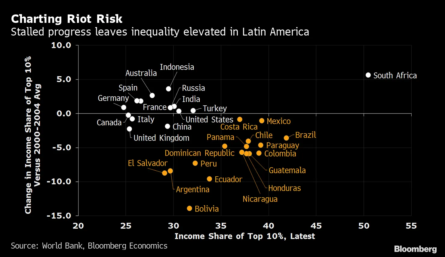 From Chile to Venezuela, 2019 has been a year of political upheaval in Latin America: Slowing growth and painful policy adjustments have exposed underlying stress from high inequality and ineffective governance. Chile’s combination of high inequality and limited progress at addressing the problem stands out -- and is a contributing factor to its recent unrest, according to research by Bloomberg Economics. Mexico and Brazil look even worse -- flagging the risk of social instability in Latin America’s other major economies, if recently-elected governments don’t meet high expectations.