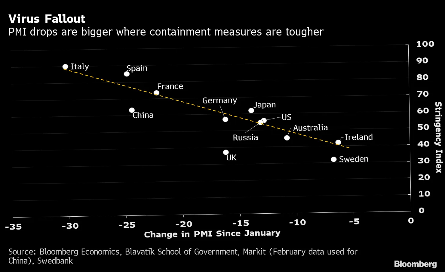 The publication of the final PMI readings in Europe on Friday gave an early glimpse of how coronavirus containment measures are pushing economies into deep recessions. But rather than the scale of the overall shock to the European economy, it’s the variation between countries that’s telling, according to Bloomberg Economics. Globally, the depth of the downturn looks strongly related to the stringency of containment measures in place.