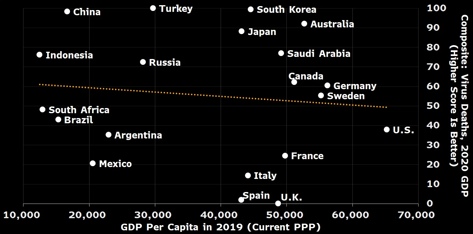 Contrary to early expectations, money didn’t buy pandemic protection, Bloomberg Economics analysis shows. China, Indonesia and Turkey are among the middle-income countries that performed best in controlling the virus and limiting economic damage. Many rich countries like the U.S., U.K. and France struggled.