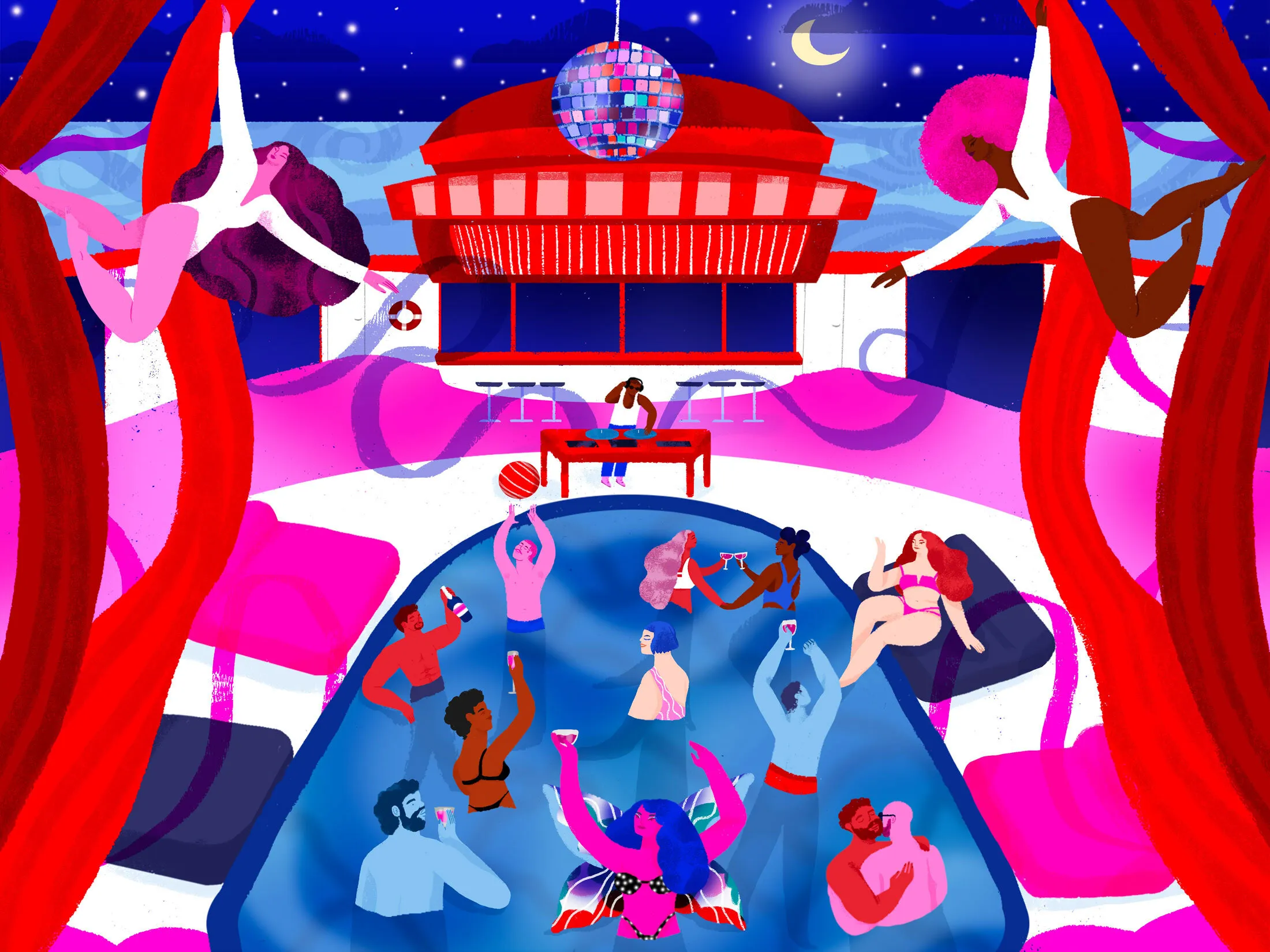 Amid the flashing lights, blaring house music, and gyrating dancers at a sea-goddess-themed bash on the 2,770-passenger Scarlet Lady, single mom Kylie Story felt so uninhibited that she jumped into the pool. She didn’t even pause to remove her long crimson dress or butterfly wings.