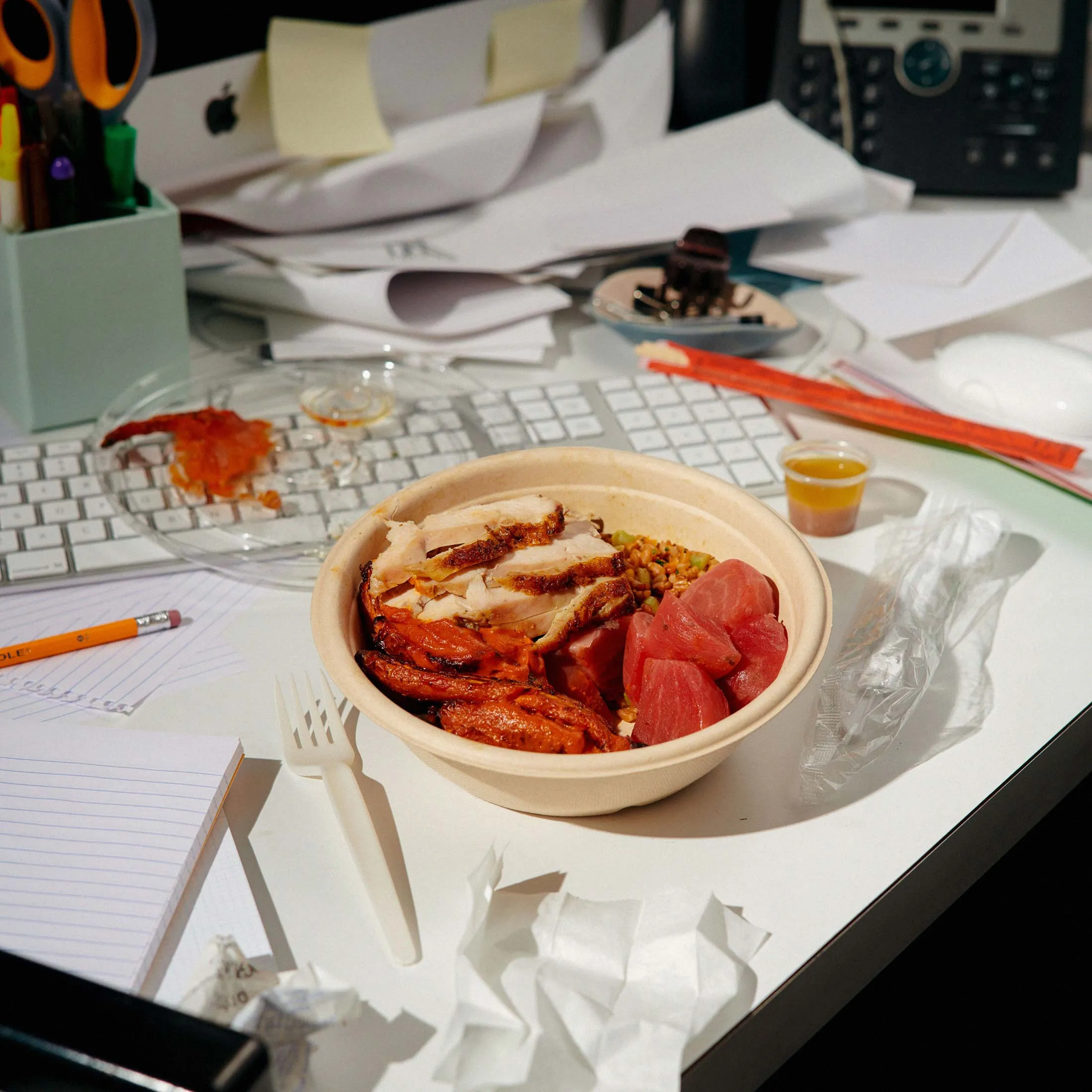On any given weekday, millions of office workers descend on downtown streets in search of a decent lunch. At noon on a Tuesday in December, some have found themselves at Dig Inn on East 52nd Street in New York, in line for a healthful-but-hearty grain bowl. Four employees dish out portions of brown rice and Brussels sprouts as several others speed around the open kitchen, replenishing trays of wild salmon and charred chicken. Off to one side, six employees bustle around two banks of steam tables, frantically assembling an endless stream of desk lunches for the growing number of customers who decide not to make the trek. An open laptop displays incoming orders from three different delivery platforms. Every few seconds a digital klaxon announces the arrival of another order, giving the feel of a nuclear power station on the verge of a meltdown.